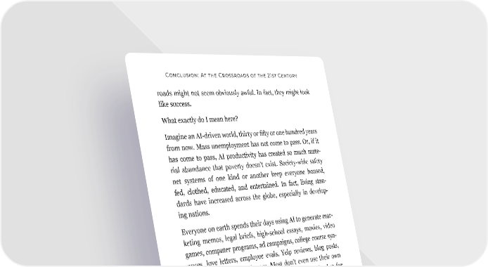 Conclusion: At the Crossroads of the 21st Century roads might not seem obviously awful. In fact, they might look like success. What exactly do I mean here? Imagine an AI-driven world, thirty or fifty or one hundred years from now. Mass unemployment has not come to pass. Or, if it has come to pass, AI productivity has created so much mate- rial abundance that poverty doesn’t exist. Society-wide safety net systems of one kind or another keep everyone housed, fed, clothed, educated, and entertained. In fact, living stan- dards have increased across the globe, especially in develop- ing nations. Everyone on earth spends their days using AI to generate mar- keting memos, legal briefs, high-school essays, movies, video games, computer programs, ad campaigns, college course syn- opses, love letters, employee evals, Yelp reviews, blog posts, recipes, song lyrics, and more. Most don’t even use their own prompts to create these things; they have an AI do that for them. But these AIs are so powerful and helpful, they don’t stop there—people rely on AI to manage their diets, pick the homes they buy, and choose when (and if) to have kids. In short, most humans lead completely de-risked lives of statis- tically probable stability and abundance. In data we trust? Algocracy for the win? Here’s how GPT-4—with an assist from the great 19th-century bard of self-determination, Henry David Thoreau—replied when I asked it to describe this world: Reid: Describe a future world where AI tools have signifi- cantly increased society’s overall productivity, prosperity, 219