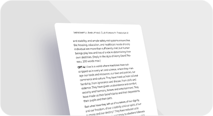 Impromptu: Amplifying Our Humanity Through AI and stability, and ample safety-net systems ensure that the housing, education, and healthcare needs of every individual are more than sufficiently met, but human beings play less and less of a role in determining their own destinies. (Reply in the style of Henry David Tho- reau. 200 words max.) GPT-4: I live in a world where machines have out- stripped us in every art and science, where they man- age our lands and resources, our laws and policies, our commerce and culture. They have freed us from toil and hardship, from ignorance and disease, from strife and violence. They have given us abundance and comfort, security and harmony, leisure and entertainment. They have made us their beneficiaries and their dependents, their pupils and their pets. But what have they left us of ourselves, of our dignity and our freedom, of our creativity and our spirit, of our purpose and our destiny? They have reduced us to passive consumers and spectators, to obedient followers and conformers, to complacent dreamers and escapists. They have dulled our senses and our souls, our curiosity and our courage, our conscience and our will. They have made us forget what it means to be human, to be alive, to be awake. I do not wish to partake of their bounty or their benev- olence, to be grateful for their gifts or their guidance, to be content with their order or their peace. I wish to reclaim my own nature and my own voice, to exercise my own reason and my own choice, to pursue my own values and my own goals. I wish to live deliberately, to front only the essential facts of life, and see if I could not learn what it had to teach, and not, when I came to die, discover that I had not lived. 220