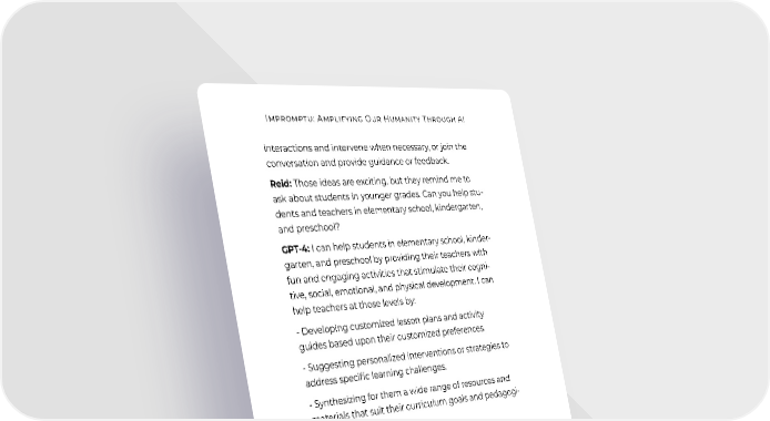 Impromptu: Amplifying Our Humanity Through AI interactions and intervene when necessary, or join the conversation and provide guidance or feedback. Reid: Those ideas are exciting, but they remind me to ask about students in younger grades. Can you help stu- dents and teachers in elementary school, kindergarten, and preschool? GPT-4: I can help students in elementary school, kinder- garten, and preschool by providing their teachers with fun and engaging activities that stimulate their cogni- tive, social, emotional, and physical development. I can help teachers at those levels by: - Developing customized lesson plans and activity guides based upon their customized preferences. - Suggesting personalized interventions or strategies to address specific learning challenges. - Synthesizing for them a wide range of resources and materials that suit their curriculum goals and pedagogi- cal approaches. These ideas from GPT-4—and many others that emerged during our interactions over the course of this chapter—start to vaguely suggest the possible benefits of LLMs for teachers, and through teachers to students, in even the most disadvantaged communities throughout America. Of course, if we want education to help lift up truly massive numbers of children of low-income parents, we need to look beyond our borders. The children of the world On average, about 25 percent of the earth’s population con- sists of children under fifteen. Latin America and India hit that average; Europe and North America skew a bit older. Africa, 40