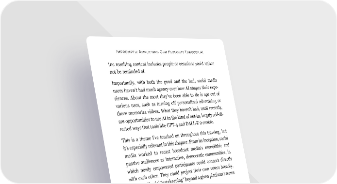 Impromptu: Amplifying Our Humanity Through AI the resulting content includes people or occasions you’d rather not be reminded of. Importantly, with both the good and the bad, social media users haven’t had much agency over how AI shapes their expe- riences. About the most they’ve been able to do is opt out of various uses, such as turning off personalized advertising or those memories videos. What they haven’t had, until recently, are opportunities to use AI in the kind of opt-in, largely self-di- rected ways that tools like GPT-4 and DALL-E 2 enable. This is a theme I’ve touched on throughout this travelog, but it’s especially relevant in this chapter. From its inception, social media worked to recast broadcast media’s monolithic and passive audiences as interactive, democratic communities, in which newly empowered participants could connect directly with each other. They could project their own voices broadly, with no editorial “gatekeeping” beyond a given platform’s terms of service. Even with the rise of recommendation algorithms, social media remains a medium where users have more chance to deter- mine their own pathways and experiences than they do in the world of traditional media. It’s a medium where they’ve come to expect a certain level of autonomy, and typically they look for new ways to expand it. Social media content creators also wear a lot of hats, especially when starting out. A new YouTube creator is probably not only functioning as her channel’s on-screen talent, but also its pro- ducer, director, writer, editor, publicist, etc. The utility of AI is obvious in this context: it’s a powerful way for creators to amplify their productive power. But it also pres- 100