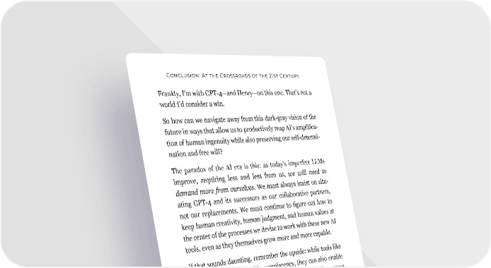 Conclusion: At the Crossroads of the 21st Century Frankly, I’m with GPT-4—and Henry—on this one. That’s not a world I’d consider a win. So how can we navigate away from this dark-gray vision of the future in ways that allow us to productively reap AI’s amplifica- tion of human ingenuity while also preserving our self-determi- nation and free will? The paradox of the AI era is this: as today’s imperfect LLMs improve, requiring less and less from us, we will need to demand more from ourselves. We must always insist on situ- ating GPT-4 and its successors as our collaborative partners, not our replacements. We must continue to figure out how to keep human creativity, human judgment, and human values at the center of the processes we devise to work with these new AI tools, even as they themselves grow more and more capable. If that sounds daunting, remember the upside: while tools like GPT-4 can certainly enable complacency, they can also enable extraordinary results. So we can use AI to help us do less, or we can use AI to help us do better. The second option is the one that will help humanity continue to progress. And, since that path of progress is the path that Homo techne has been on, collectively, ever since the days of early hominids like Lucy, I’m optimistic that’s the path we’ll choose. Are you ready for this journey? 221