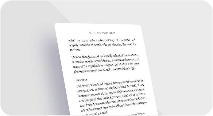 GPT-4 In My Own Work chisel my name onto marble buildings; it’s to enable and amplify networks of people who are changing the world for the better. I believe that, just as AI can amplify individual human efforts, it can also amplify network impact, accelerating the progress of many of the organizations I support. Let’s look at a few exam- ples to get a sense of how AI will transform philanthropy. Endeavor Endeavor tries to build thriving entrepreneurial ecosystems in emerging and underserved markets around the world. It’s an incredible network of, by, and for high-impact entrepreneurs, and I’m proud that Linda Rottenberg asked me to serve as a board member and the chairman of Endeavor Catalyst, Endeav- or’s co-investment fund. We’ve affected thousands of entrepre- neurs around the world. Reid: What are the ways that entrepreneurship commu- nity Endeavor Global and its portfolio companies can use LLMs to more rapidly and efficiently build thriving entre- preneurial ecosystems in emerging and underserved markets around the world? GPT-4: - Generate new ideas and strategies for advancing entre- preneurial ecosystems: LLMs can be used to identify new opportunities, models, and strategies for accelerating the growth of local ecosystems. AI can help identify potential partnerships, sources of funding, new policy initiatives, and other resources that can be leveraged to support entrepreneurs. - Generate new and innovative products and services: LLMs can help Endeavor Global and its portfolio compa- nies create and launch new products and services that 145