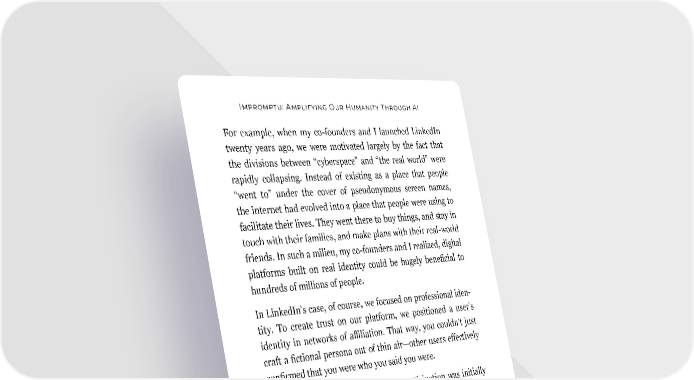 Impromptu: Amplifying Our Humanity Through AI For example, when my co-founders and I launched LinkedIn twenty years ago, we were motivated largely by the fact that the divisions between “cyberspace” and “the real world” were rapidly collapsing. Instead of existing as a place that people “went to” under the cover of pseudonymous screen names, the internet had evolved into a place that people were using to facilitate their lives. They went there to buy things, and stay in touch with their families, and make plans with their real-world friends. In such a milieu, my co-founders and I realized, digital platforms built on real identity could be hugely beneficial to hundreds of millions of people. In LinkedIn’s case, of course, we focused on professional iden- tity. To create trust on our platform, we positioned a user’s identity in networks of affiliation. That way, you couldn’t just craft a fictional persona out of thin air—other users effectively confirmed that you were who you said you were. At Facebook, launched a year later, participation was initially limited to students with verified college email addresses. And while Facebook didn’t require new users to upload photos of themselves, that’s clearly the norm it was hoping to establish. Through such approaches, social media helped real identity take root online in a meaningful way for the first time. And yet social media’s emphasis on broad participation also left it vulnerable to various kinds of deception, some human-gener- ated, some automated. As I’ve written elsewhere, I believe most social media platforms underestimated how much governance online communities would require, especially as they scaled to hundreds of millions of users or more. 102