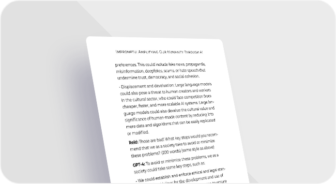 Impromptu: Amplifying Our Humanity Through AI preferences. This could include fake news, propaganda, misinformation, deepfakes, scams, or hate speech that undermine trust, democracy, and social cohesion. - Displacement and devaluation: Large language models could also pose a threat to human creators and workers in the cultural sector, who could face competition from cheaper, faster, and more scalable AI systems. Large lan- guage models could also devalue the cultural value and significance of human-made content by reducing it to mere data and algorithms that can be easily replicated or modified. Reid: Those are bad! What key steps would you recom- mend that we as a society take to avoid or minimize these problems? (200 words) (same style as above) GPT-4: To avoid or minimize these problems, we as a society could take some key steps, such as: - We could establish and enforce ethical and legal stan- dards and guidelines for the development and use of large language models in the cultural sector, to ensure that it respects human rights, dignity, and diversity, and that it does not harm or deceive consumers or creators. We could also create mechanisms for transparency, accountability, and auditability of large language models and their outputs, to prevent misuse, abuse, or error. - We could also educate and empower consumers and creators to be aware of the potential benefits and risks of large language models in the cultural sector, and to develop critical and creative skills to evaluate, use, and produce content with or without AI assistance. We could also foster a culture of media literacy, digital citizenship, and information hygiene that promotes responsible and ethical consumption and creation of content. - And we could support and recognize human creators and workers in the cultural sector, by providing them 60