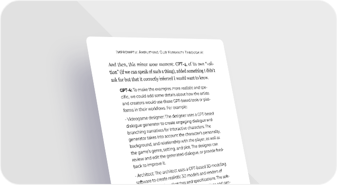 Impromptu: Amplifying Our Humanity Through AI And then, this minor wow moment: GPT-4, of its own “voli- tion” (if we can speak of such a thing), added something I didn’t ask for but that it correctly inferred I would want to know. GPT-4: To make the examples more realistic and spe- cific, we could add some details about how the artists and creators would use these GPT-based tools or plat- forms in their workflows. For example: - Videogame designer: The designer uses a GPT-based dialogue generator to create engaging dialogue and branching narratives for interactive characters. The generator takes into account the character’s personality, background, and relationship with the player, as well as the game’s genre, setting, and plot. The designer can review and edit the generated dialogue, or provide feed- back to improve it. - Architect: The architect uses a GPT-based 3D modeling software to create realistic 3D models and renders of buildings based on sketches and specifications. The soft- ware interprets the sketches and specifications and gen- erates high-quality models that match the architect’s vision and style. The software also allows the architect to modify and refine the models, as well as view them from different angles and perspectives. - Sculptor: The sculptor uses a GPT-based sculpture generator to analyze the shape, texture, and material of existing sculptures and propose new variations and combinations. The generator scans the sculptures and generates novel forms that are inspired by or contrast with them. The sculptor can select and manipulate the generated forms, or use them as inspiration for their own creations. . . . and so on. 58