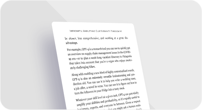 Impromptu: Amplifying Our Humanity Through AI be slower, less comprehensive, and working at a great dis- advantage. For example, GPT-4 is a research tool you can use to quickly get an overview on supply chain management issues in the COVID- 19 era—or to plan a week-long vacation itinerary to Patagonia that takes into account that you’re a vegan who enjoys moder- ately challenging hikes. Along with enabling a new kind of highly contextualized search, GPT-4 is also an extremely versatile brainstorming and pro- duction aid. You can use it to help you write a wedding toast, a job offer, a novel in verse. You can use it to figure out how to turn the leftovers in your fridge into a tasty meal. Whatever your skill level at a given task, GPT-4 can potentially amplify your abilities and productivity, so it’s equally useful to beginners, experts, and everyone in between. Given a request for any sort of information that you might ask a human assis- tant for, GPT-4 can come back instantly with an answer that is likely between good and excellent quality (though also with a non-zero chance of completely missing the mark, as we’ll see). Developers, I realized, would soon be adding GPT-4 to thou- sands of existing apps and building thousands of new apps around it. It is, all said, a technology that deftly leverages some of our most significant technologies from the last thirty years—includ- ing the internet, mobile, cloud computing, and data analytics— to put the protean power of always-on AI into the hands of hun- dreds of millions of people. Sounds a little bit like the start of a new world, doesn’t it? 6