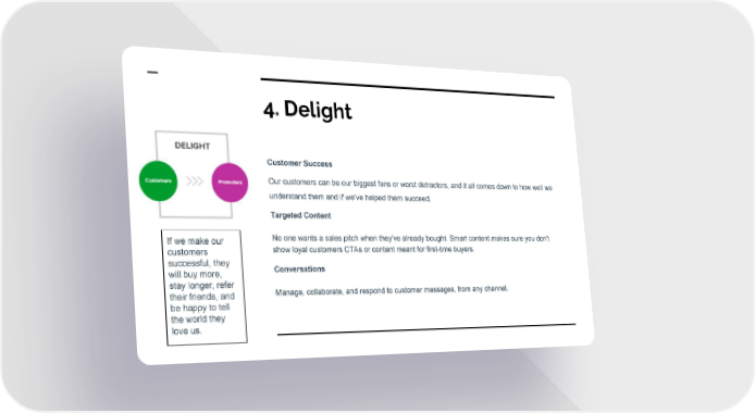 4. Delight Customer Success Our customers can be our biggest fans or worst detractors, and it all comes down to how well we understand them and if we’ve helped them succeed. Targeted Content No one wants a sales pitch when they've already bought. Smart content makes sure you don't If we make our show loyal customers CTAs or content meant for first-time buyers. customers successful, they Conversations will buy more, stay longer, refer Manage, collaborate, and respond to customer messages, from any channel. their friends, and be happy to tell the world they love us.