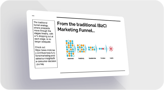 The traditional From the traditional (B2C) funnel analogy, where prospects Marketing Funnel... move through the stages linearly, with a % dropping out at each stage, is no longer adequate. Check out: https://www.mckinse y.com/business-func tions/marketing-and- sales/our-insights/th e-consumer-decision -journey