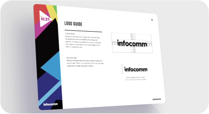 BRAND GUIDELINES Web: No smaller than 35px in height Print: No smaller than 1/2 inch in height LOGO GUIDE MINIMUM SIZE The logo has been designed to be a minimum size of 1/2 inch in height. There is no maximum size. On web the logo should be no smaller than 35px in height. CLEAR SPACE To protect the clarity and integrity, the InfoComm logo should be kept clear of competing text, images and graphics. It must be surrounded on all sides by adequate clear space - a space equal in size to the height of the letter ‘m’ within the logo. 6.