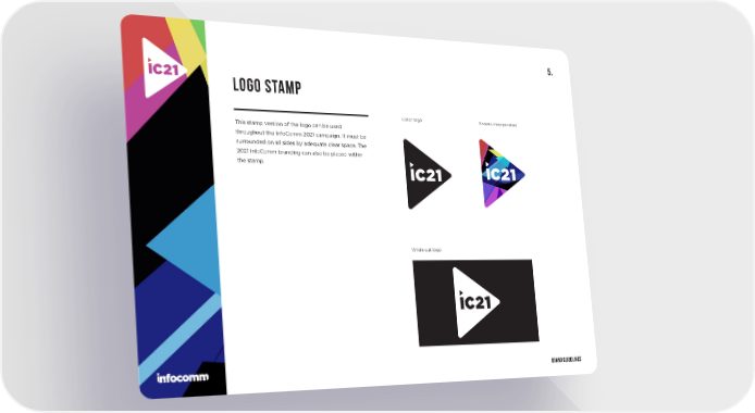 BRAND GUIDELINES Color logo Shapes incorporated White out logo This stamp version of the logo can be used throughout the InfoComm 2021 campaign. It must be surrounded on all sides by adequate clear space. The 2021 InfoComm branding can also be placed within the stamp. LOGO STAMP 5.