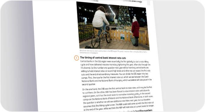 ING global economic outlook 2023 December 2022 Our 3 calls for Central and Eastern Europe Frantisek Taborsky After an unprecedented wave of monetary tightening in Central and Eastern Europe, EMEA FX&FI Strategist we expect the region to start normalising monetary conditions. Although headline [email protected] inflation will slow, core inflation is proving more persistent, and that poses a major dilemma for central banks Who'll win the race to start cutting rates in the CEE region? Pictured: A woman rides a charging bike to light a Christmas tree in Budapest 1 The timing of central bank interest rate cuts Central banks in the CEE region were essentially the first globally to start a rate hiking cycle and have delivered massive monetary tightening this year, often also through the FX channel. So the number one question next year will be how long central banks are willing to hold interest rates at record high levels and when we can expect the first rate cuts and the end of extraordinary measures. You can divide the CEE region into two camps. First, the race for the first interest rate cut, which we see between the Czech National Bank and the National Bank of Hungary, which we believe will take place in the second quarter. On the one hand, the CNB was the first central bank to raise rates, so it may be the first to cut them. On the other, NBH has been forced to raise interest rates well above its regional peers, so it has the most room to normalise monetary policy. In the second camp are the National Bank of Poland and the National Bank of Romania. In both cases, the question is whether we will see additional rate hikes next year, but our baseline assumes that the hiking cycle is over. The NBR could well come up with the first rate cut at the end of the year, while we think the NBP will hold rates at current levels for longer. 2 Persistence of core inflation despite slowdown in headline numbers Although the theme of high inflation is a global one, CEE is leading the way for two reasons. Firstly, while inflation in the eurozone has touched 10% Year-on-Year, we're talking about levels in the range of 16-23% in CEE. Secondly, the inflation story is not just focused on energy prices but affects the overall consumer basket. While core inflation in the eurozone is half the headline number, in Central and Eastern Europe, core is only slightly slower than the headline in most cases. That's due partly to the record- tight labour market, the convergence of economies and the differing composition of the consumer basket.
