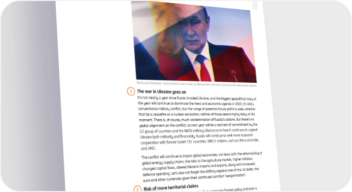 ING global economic outlook 2023 December 2022 Our 3 calls for global politics Geopolitics continue to be an important driver for financial markets and the global economy. Predicting future geopolitical moves is always a bit of a fool's game but here Carsten Brzeski are three developments to watch out for Global Head of Macro and Chief Economist, Eurozone, Germany, Austria [email protected] The Russian President, Vladimir Putin's next moves on Ukraine will continue to dominate the international agenda 1 The war in Ukraine goes on It's not nearly a year since Russia invaded Ukraine, and the biggest geopolitical story of the year will continue to dominate the news and economic agenda in 2023. It's still a conventional military conflict, but the range of potential future paths is wide, whether that be a ceasefire or a nuclear escalation; neither of those seems highly likely at the moment. There is, of course, much condemnation of Russia's actions. But there's no global alignment on the conflict, so next year will be a real test of commitment by the G7 group of countries and the NATO military alliance as to how it continues to support Ukraine both militarily and financially. Russia will continue to seek more economic cooperation with former Soviet 'CIS' countries, 'BRICS' nations, such as China and India, and OPEC. The conflict will continue to impact global economies, not least with the reformatting of global energy-supply chains, the risks to the agriculture market, higher inflation, changed capital flows, altered bilateral imports and exports, along with increased defence spending. Let's also not forget the shifting regional role of the US dollar, the euro and other currencies given their continued sanction 'weaponisation'. 2 Risk of more territorial claims The war in Ukraine shows us, yet again, that aggressive foreign policy and even a regional military conflict can sometimes be used by national elites as a way of distracting their people from domestic political and economic issues. One of the biggest potential flashpoints is China and Taiwan. But let's not forget that disputes such as those between Turkey and Northern Cyprus, and Azerbaijan and Armenia over Nagorno Karabakh continue to bubble away. Taiwan could become more of a focus for financial markets next year, although any moves here are highly unlikely. Turkey is set to hold presidential and parliamentary elections in June. Current economic issues, including the depreciation of the lira and extremely high inflation, have already