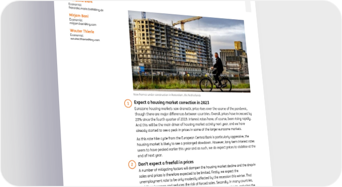 ING global economic outlook 2023 December 2022 Our 3 calls for eurozone real estate Eurozone real estate is set for a correction on higher rates Bert Colijn Senior Economist, Eurozone bert.colijn@ing.com Franziska Biehl Economist franziska.marie.biehl@ing.de Mirjam Bani Economist mirjam.bani@ing.com Wouter Thierie Economist wouter.thierie@ing.com New homes under construction in Rotterdam, the Netherlands 1 Expect a housing market correction in 2023 Eurozone housing markets saw dramatic price rises over the course of the pandemic, though there are major differences between countries. Overall, prices have increased by 20% since the fourth quarter of 2019. Interest rates have, of course, been rising rapidly. And this will be the main driver of housing market activity next year, and we have already started to see a peak in prices in some of the larger eurozone markets. As this rate hike cycle from the European Central Bank is particularly aggressive, the housing market is likely to see a prolonged slowdown. However, long-term interest rates seem to have peaked earlier this year and as such, we do expect prices to stabilise at the end of next year. 2 Don’t expect a freefall in prices A number of mitigating factors will dampen the housing market decline and the drop in sales and prices is therefore expected to be limited. Firstly, we expect the unemployment rate to be only modestly affected by the recession this winter. That stabilises incomes and reduces the risk of forced sales. Secondly, in many countries, more people have moved to longer-term fixed-rate mortgage contracts, reducing the direct effect of interest rate swings on homeowners' mortgage costs. Lastly, many countries still face housing shortages to some degree, which also has a moderating effect on the size of the correction. At the moment, we expect prices in the eurozone to correct by about 5-10% on average over the course of the year. This would still leave prices well above the pre-pandemic level. 3 Supply remains the bottleneck for green renovation in 2023 The green transformation in the housing market is in full swing at the moment. Regulatory drivers and government investment are pulling in that direction and now we