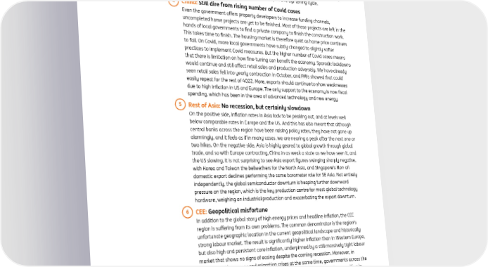 ING global economic outlook 2023 December 2022 most households from April, and the housing market is showing very early signs of faltering. Despite the sharp fall in swap rates since September’s mini-budget crisis, mortgage rates have fallen much more gradually. A recession now looks virtually inevitable, though it might not be until the first quarter until we see more material signs of slowing. The Bank of England has begun to talk down market rate hike pricing, and investors have taken the hint, but are still probably overestimating what is to come. We expect the BoE to pivot back to a 50bp hike in December, and expect one further 50bp move in February, which is likely to mark the top of this tightening cycle. 4 China: Still dire from rising number of Covid cases Even the government offers property developers to increase funding channels, uncompleted home projects are yet to be finished. Most of those projects are left in the hands of local governments to find a private company to finish the construction work. This takes time to finish. The housing market is therefore quiet as home price continues to fall. On Covid, more local governments have subtly changed to slightly softer practices to implement Covid measures. But the higher number of Covid cases means that there is limitation on how fine-tuning can benefit the economy. Sporadic lockdowns would continue and still affect retail sales and production adversely. We have already seen retail sales fell into yearly contraction in October, and PMIs showed that could easily repeat for the rest of 4Q22. More, exports should continue to show weaknesses due to high inflation in US and Europe. The only support to the economy is now fiscal spending, which has been in the area of advanced technology and new energy. 5 Rest of Asia: No recession, but certainly slowdown On the positive side, inflation rates in Asia look to be peaking out, and at levels well below comparable rates in Europe and the US. And this has also meant that although central banks across the region have been raising policy rates, they have not gone up alarmingly, and it feels as if in many cases, we are nearing a peak after the next one or two hikes. On the negative side, Asia is highly geared to global growth through global trade, and so with Europe contracting, China in as weak a state as we have seen it, and the US slowing, it is not surprising to see Asia export figures swinging sharply negative, with Korea and Taiwan the bellwethers for the North Asia, and Singapore’s Non-oil domestic export declines performing the same barometer role for SE Asia. Not entirely independently, the global semiconductor downturn is heaping further downward pressure on the region, which is the key production centre for most global technology hardware, weighing on industrial production and exacerbating the export downturn. 6 CEE: Geopolitical misfortune In addition to the global story of high energy prices and headline inflation, the CEE region is suffering from its own problems. The common denominator is the region's unfortunate geographic location in the current geopolitical landscape and historically strong labour market. The result is significantly higher inflation than in Western Europe, but also high and persistent core inflation, underpinned by a still massively tight labour market that shows no signs of easing despite the coming recession. Moreover, in response to the energy and migration crises at the same time, governments across the region have come up with another wave of household support spending, resulting in massive twin deficits. However, this has been countered by central banks tightening monetary conditions through interest rate hikes, well above global peers, but also often through the FX channel. The resulting picture of this wild mix for next year is thus a shallow recession driven mainly by a fall in household consumption, only gradually slowing inflation with a possible upside surprise, and cautious central bank foot-dragging around the timing of the start of monetary policy normalisation.