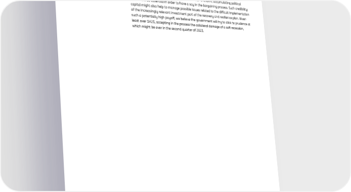 ING global economic outlook 2023 December 2022 3 Italy: Temporarily investing in credibility capital The new Meloni government has so far adopted a prudent approach to fiscal policies, preferring continuity over disruption. The draft budget, still under discussion, is a case in point. It prioritises tackling the energy price emergency with a piecemeal approach (it is funded in deficit until the first quarter of next year), limiting outlays for other items such as pensions, the reduction of the tax wedge and the flat tax. Crucially, it does so while already targeting a sizeable adjustment in 2023, when the Stability and Growth Pact (SGP) will still be suspended. In the year of the SGP's reform, accumulating political credits will be essential in order to have a say in the bargaining process. Such credibility capital might also help to manage possible issues related to the difficult implementation of the increasingly relevant investment part of the recovery and resilience plan. Given such a potentially high payoff, we believe the government will try to stick to prudence at least over 1H23, accepting in the process the collateral damage of a soft recession, which might be over in the second quarter of 2023.