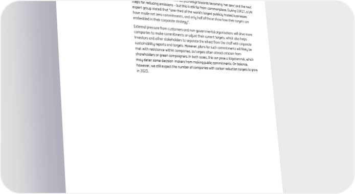 ING global economic outlook 2023 December 2022 volumes as consumers show little appetite to make major purchases. As a result, we’ve seen warehouses and distribution centres in both the EU and the US fill up. These trends also affect companies that ship goods. For leisure providers, 2023 is likely to provide a reality check after a post-Covid spending boom. Output in sectors like accommodation and aviation will still fall short of pre-Covid levels in developed economies. 3 Pressure set to continue for corporates to do more on carbon reduction Some companies have now defined pathways towards becoming 'net zero' and the next steps for reducing emissions – but this is still far from commonplace. During COP27, a UN expert group stated that "one-third of the world’s largest publicly-traded businesses have made net zero commitments, and only half of those show how their targets are embedded in their corporate strategy". External pressure from customers and non-governmental organisations will drive more companies to make commitments or adjust their current targets, which also helps investors and other stakeholders to separate the wheat from the chaff with corporate sustainability reports and targets. However, plans for such commitments will likely be met with resistance within companies, as targets often attract criticism from shareholders or green campaigners. In both cases, this can pose a litigation risk, which may deter some decision-makers from making public commitments. On balance, however, we still expect the number of companies with carbon reduction targets to grow in 2023.