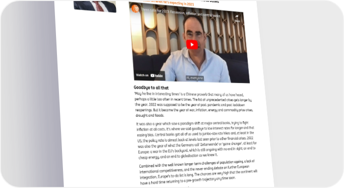 ING global economic outlook 2023 December 2022 ‘May he live in interesting times’ Rarely have predictions for an upcoming year been so difficult and wide-ranging. But we are sure of some things, and we are doing our best to help you navigate this unprecedented uncertainty 3 calls for 2023: Recession, inflation and central banks Carsten Brzeski on what he's expecting in 2023 Goodbye to all that 'May he live in interesting times' is a Chinese proverb that many of us have heard, perhaps a little too often in recent times. The list of unprecedented crises gets longer by the year. 2022 was supposed to be the year of post-pandemic and post-lockdown reopenings. But it became the year of war, inflation, energy and commodity price crises, drought and floods. It was also a year which saw a paradigm shift at major central banks, trying to fight inflation at all costs. It's where we said goodbye to low interest rates for longer and that easing bias. Central banks got all of us used to jumbo-size rate hikes and, at least in the US, the policy rate is almost back at levels last seen prior to other financial crises. 2022 was also the year of what the Germans call 'Zeitenwende' or 'game changer', at least for Europe: a war in the EU’s backyard, which is still ongoing with no end in sight; an end to cheap energy, and an end to globalisation as we knew it. Combined with the well-known longer-term challenges of population ageing, a lack of international competitiveness, and the never-ending debate on further European integration, Europe's to-do list is long. The chances are very high that the continent will have a hard time returning to a pre-growth trajectory any time soon. Different shades of recession So what will 2023 bring? A natural reflex of many forecasters is to simply extrapolate recent trends and developments into the new year. And, indeed, many of this year's issues will also be prominent in the next: war, the energy crisis, inflation, trade tensions and even Covid are likely to affect the global economy significantly. This is not the moment to identify potential new black or grey swans... nor even pink ones. Our predictions and calls for 2023 reflect our base case: median forecasts backed by this year’s events and assumptions. We expect to see several different shades of recession in 2023. We should get a rather textbook-style recession in the US with the central bank hiking rates until the real estate