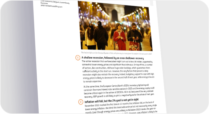 ING global economic outlook 2023 December 2022 Our 3 calls for the eurozone After a mild winter recession, the eurozone is likely to see a very subdued recovery, while inflation is bound to end in 2023 above 3%. Meanwhile, the pressure to return to Carsten Brzeski some form of fiscal orthodoxy might create tensions both within and between Global Head of Macro and Chief Economist, Eurozone, Germany, Austria eurozone member states [email protected] Peter Vanden Houte Chief Economist, Belgium, Luxembourg, Eurozone [email protected] The festive lights on the Champs-Elysees in Paris will give way to more gloom for people in the eurozone in 2023 1 A shallow recession, followed by an even shallower recovery The winter recession that we forecasted might turn out to be a bit milder, supported by somewhat lower energy prices and significant fiscal stimulus. On top of that, a number of sectors, like construction, still have huge order backlogs, which guarantees them sufficient activity in the short run. However, the very factors that prevent a deep recession might also restrain the recovery. Indeed, budgetary support to cope with high energy prices is likely to decrease in the second half of next year, while energy is bound to remain expensive. At the same time, the European Central Bank's (ECB's) monetary tightening will constrain the more interest rate-sensitive sectors in 2023 and the energy supply could become critical again in the winter of 2023/24. All in all, because of the very subdued recovery, GDP growth is still likely to print a negative figure for the whole of next year. 2 Inflation will fall, but the 2% goal is not yet in sight November 2022 marked the first time in 17 months that inflation fell, on the back of lower energy inflation. We think this trend will continue but not necessarily every single month. Even though energy prices are unlikely to fall below 2022’s levels, the year-on- year comparison will be less punitive than in 2022. However, core inflation is likely to be stickier. The start of the year might see important price increases on the back of inflation indexation and energy price pass-through. Higher wage-induced costs will also keep some upward pressure on services prices. We agree that dwindling demand and high inventories will slow the month-on-month increases in core prices over the course of the year. But even then, December 2023 is still likely to see both headline and core inflation above 3%.