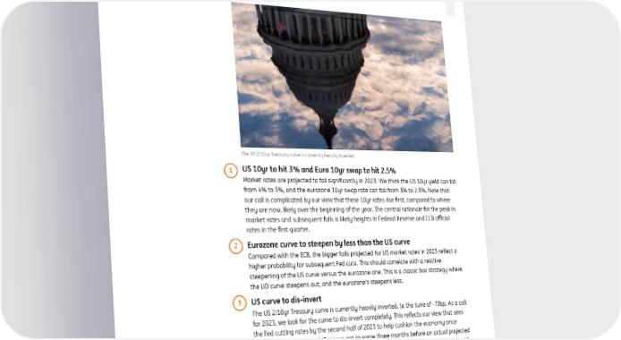 ING global economic outlook 2023 December 2022 Our 3 calls for rates 2023 is shaping up to be a year of turning points, as market rates peak out and drop, Padhraic Garvey and curves re-steepen as future cuts are contemplated, especially in the US Head of Global Debt and Rates Strategy/ Regional Head of Research, Americas padhraic.garvey@ing.com The US 2/10yr Treasury curve is currently heavily inverted 1 US 10yr to hit 3% and Euro 10yr swap to hit 2.5% Market rates are projected to fall significantly in 2023. We think the US 10yr yield can fall from 4% to 3%, and the eurozone 10yr swap rate can fall from 3% to 2.5%. Note that our call is complicated by our view that these 10yr rates rise first, compared to where they are now, likely over the beginning of the year. The central rationale for the peak in market rates and subsequent falls is likely heights in Federal Reserve and ECB official rates in the first quarter. 2 Eurozone curve to steepen by less than the US curve Compared with the ECB, the bigger falls projected for US market rates in 2023 reflect a higher probability for subsequent Fed cuts. This should correlate with a relative steepening of the US curve versus the eurozone one. This is a classic box strategy where the UD curve steepens out, and the eurozone's steepens less. 3 US curve to dis-invert The US 2/10yr Treasury curve is currently heavily inverted, to the tune of -70bp. As a call for 2023, we look for the curve to dis-invert completely. This reflects our view that sees the Fed cutting rates by the second half of 2023 to help cushion the economy once inflation has been tamed. Once we get to some three months before an actual projected cut, the 2yr yield can collapse lower to match the 10yr yield, and actual Fed cuts should correlate with the 2yr trading through the 10yr (classic positive curve). 42