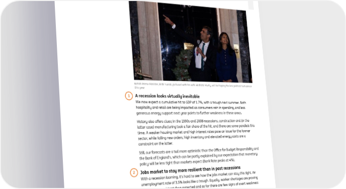ING global economic outlook 2023 December 2022 Our 3 calls for the UK A recession looks virtually inevitable in the UK but the jobs market could prove more resilient than in past downturns. Inflation should begin to fall more noticeably from the James Smith spring Economist, Developed Markets [email protected] British Prime Minister, Rishi Sunak, pictured with his wife Akshata Murty, will be hoping for less political turbulence this year 1 A recession looks virtually inevitable We now expect a cumulative hit to GDP of 1.7%, with a trough next summer. Both hospitality and retail are being impacted as consumers rein in spending, and less generous energy support next year points to further weakness in these areas. History also offers clues; in the 1990s and 2008 recessions, construction and (in the latter case) manufacturing took a fair share of the hit, and there are some parallels this time. A weaker housing market and high interest rates pose an issue for the former sector, while falling new orders, high inventory and elevated energy costs are a constraint on the latter. Still, our forecasts are a tad more optimistic than the Office for Budget Responsibility and the Bank of England's, which can be partly explained by our expectation that monetary policy will be less tight than markets expect (Bank Rate peaks at 4%). 2 Jobs market to stay more resilient than in past recessions With a recession looming, itβs hard to see how the jobs market can stay this tight. An unemployment rate of 3.5% looks like a trough. Equally, worker shortages are proving much more persistent than expected and so far there are few signs of overt weakness other than a modest reduction in vacancy numbers. Those shortages are partly linked to higher rates of long-term sickness, which has drawn workers out of predominantly lower-paid consumer service roles. The UK is unique in seeing rates of inactive workers increase β most countries have seen a resumed downtrend post-Covid. This is partly linked to healthcare delays β and waiting lists are expected to continue growing β so we expect this trend to continue. Reduced numbers of EU workers in the UK labour market have also amplified shortages, albeit non-EU employment has increased dramatically.