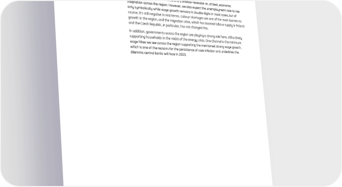 ING global economic outlook 2023 December 2022 The second big question for us is: how fast will inflation slow? It is core inflation that has shown a surprise to the upside in recent months and that remains our baseline scenario for next year. It will be very difficult for central banks to find a way through this minefield of seemingly slowing headline inflation with resistant core inflation hiding the inflationary essence of the CEE region, which was here with us even before the energy crisis and even before the Covid years. 3 Tight labour market despite recession For next year, our baseline scenario is a shallow recession or, at best, economic stagnation across the region. However, we also expect the unemployment rate to rise only symbolically while wage growth remains in double digits in most cases, but of course, it's still negative in real terms. Labour shortages are one of the main barriers to growth in the region, and the migration crisis, which has boosted labour supply in Poland and the Czech Republic, in particular, has not changed this. In addition, governments across the region are playing a strong role here, still actively supporting households in the midst of the energy crisis. One channel is the minimum wage hikes we see across the region supporting the mentioned strong wage growth, which is one of the reasons for the persistence of core inflation and underlines the dilemma central banks will face in 2023.