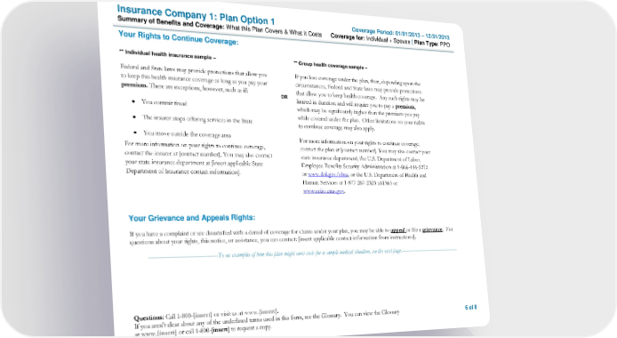 Insurance Company 1: Plan Option 1 Coverage Period: 01/01/2013 – 12/31/2013 Summary of Benefits and Coverage: What this Plan Covers & What it Costs Coverage for: Individual + Spouse | Plan Type: PPO Your Rights to Continue Coverage: ** Individual health insurance sample – ** Group health coverage sample – Federal and State laws may provide protections that allow you If you lose coverage under the plan, then, depending upon the to keep this health insurance coverage as long as you pay your circumstances, Federal and State laws may provide protections premium. There are exceptions, however, such as if: OR that allow you to keep health coverage. Any such rights may be limited in duration and will require you to pay a premium, You commit fraud which may be significantly higher than the premium you pay The insurer stops offering services in the State while covered under the plan. Other limitations on your rights to continue coverage may also apply. You move outside the coverage area For more information on your rights to continue coverage, For more information on your rights to continue coverage, contact the plan at [contact number]. You may also contact your contact the insurer at [contact number]. You may also contact state insurance department, the U.S. Department of Labor, your state insurance department at [insert applicable State Employee Benefits Security Administration at 1-866-444-3272 Department of Insurance contact information]. or www.dol.gov/ebsa, or the U.S. Department of Health and Human Services at 1-877-267-2323 x61565 or www.cciio.cms.gov. Your Grievance and Appeals Rights: If you have a complaint or are dissatisfied with a denial of coverage for claims under your plan, you may be able to appeal or file a grievance. For questions about your rights, this notice, or assistance, you can contact: [insert applicable contact information from instructions]. ––––––––––––––––––––––To see examples of how this plan might cover costs for a sample medical situation, see the next page.–––––––––––––––––––––– Questions: Call 1-800-[insert] or visit us at www.[insert]. If you aren’t clear about any of the underlined terms used in this form, see the Glossary. You can view the Glossary 6 of 8 at www.[insert] or call 1-800-[insert] to request a copy.