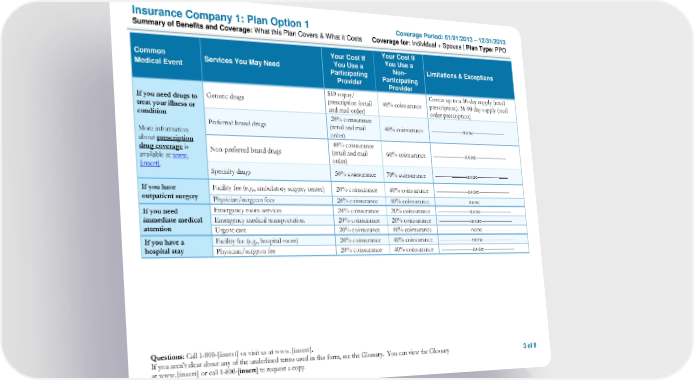 Insurance Company 1: Plan Option 1 Coverage Period: 01/01/2013 – 12/31/2013 Summary of Benefits and Coverage: What this Plan Covers & What it Costs Coverage for: Individual + Spouse | Plan Type: PPO Your Cost If Your Cost If Common You Use a You Use a Medical Event Services You May Need Participating Non- Limitations & Exceptions Provider Participating Provider $10 copay/ Covers up to a 30-day supply (retail If you need drugs to Generic drugs prescription (retail 40% coinsurance prescription); 31-90 day supply (mail treat your illness or and mail order) order prescription) condition 20% coinsurance Preferred brand drugs (retail and mail 40% coinsurance –––––––––––none––––––––––– More information order) about prescription 40% coinsurance drug coverage is Non-preferred brand drugs (retail and mail 60% coinsurance –––––––––––none––––––––––– available at www. order) [insert]. Specialty drugs 50% coinsurance 70% coinsurance –––––––––––none––––––––––– If you have Facility fee (e.g., ambulatory surgery center) 20% coinsurance 40% coinsurance –––––––––––none––––––––––– outpatient surgery Physician/surgeon fees 20% coinsurance 40% coinsurance –––––––––––none––––––––––– If you need Emergency room services 20% coinsurance 20% coinsurance –––––––––––none––––––––––– immediate medical Emergency medical transportation 20% coinsurance 20% coinsurance –––––––––––none––––––––––– attention Urgent care 20% coinsurance 40% coinsurance –––––––––––none––––––––––– If you have a Facility fee (e.g., hospital room) 20% coinsurance 40% coinsurance –––––––––––none––––––––––– hospital stay Physician/surgeon fee 20% coinsurance 40% coinsurance –––––––––––none––––––––––– Questions: Call 1-800-[insert] or visit us at www.[insert]. If you aren’t clear about any of the underlined terms used in this form, see the Glossary. You can view the Glossary 3 of 8 at www.[insert] or call 1-800-[insert] to request a copy.