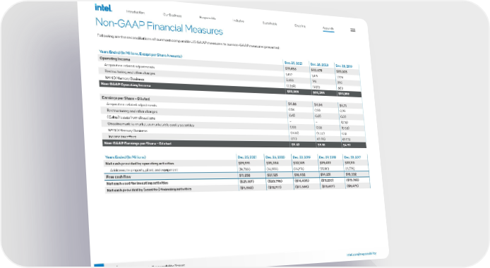 95 intel.com/responsibility 2021-22 Corporate Responsibility Report Non-GAAP Financial Measures Following are the reconciliations of our most comparable US GAAP measures to our non-GAAP measures presented: Years Ended (In Millions, Except per Share Amounts) Dec. 25, 2021 Dec. 26, 2020 Dec. 28, 2019 Operating Income $19,456 $23,678 $22,035 Acquisition-related adjustments 1,492 1,416 1,324 Restructuring and other charges 2,626 198 393 NAND Memory Business (1,369) (937) 600 Non-GAAP Operating Income $22,205 $24,355 $24,352 Earnings per Share – Diluted $4.86 $4.94 $4.71 Acquisition-related adjustments 0.36 0.33 0.29 Restructuring and other charges 0.65 0.05 0.09 (Gains) losses from divestiture – – (0.16) Ongoing mark-to-market on marketable equity securities 0.03 0.03 (0.06) NAND Memory Business (0.33) (0.22) 0.13 Income tax effect (0.1) (0.03) (0.03) Non-GAAP Earnings per Share – Diluted $5.47 $5.10 $4.97 Years Ended (In Millions) Dec. 25, 2021 Dec. 26, 2020 Dec. 28, 2019 Dec. 29, 2018 Dec. 30, 2017 Net cash provided by operating activities $29,991 $35,384 $33,145 $29,432 $22,110 Additions to property, plant, and equipment (18,733) (14,259) (16,213) (15,181) (11,778) Free cash flow $11,258 $21,125 $16,932 $14,251 $10,332 Net cash used for investing activities ($25,167) ($20,796) ($14,405) ($11,239) ($15,762) Net cash provided by (used for) financing activities ($5,862) ($12,917) ($17,565) ($18,607) ($8,475) Introduction Our Business Responsible Inclusive Sustainable Enabling Appendix