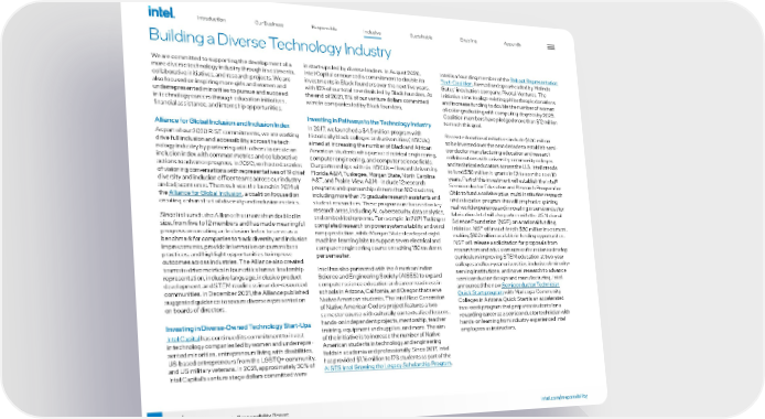 58 intel.com/responsibility 2021-22 Corporate Responsibility Report Building a Diverse Technology Industry We are committed to supporting the development of a more diverse technology industry through investments, collaborative initiatives, and research projects. We are also focused on inspiring more girls and women and underrepresented minorities to pursue and succeed in technology careers through education initiatives, financial assistance, and internship opportunities. Alliance for Global Inclusion and Inclusion Index As part of our 2030 RISE commitments, we are working drive full inclusion and accessibility across the tech - nology industry by partnering with others to create an inclusion index with common metrics and collaborative actions to advance progress. In 2020, we hosted a series of visioning conversations with representatives of 19 chief diversity and inclusion officer teams across our industry and adjacent ones. The result was the launch in 2021 of the Alliance for Global Inclusion , a coalition focused on creating a shared set of diversity and inclusion metrics. Since its launch, the Alliance has more than doubled in size, from five to 12 members and has made meaningful progress on creating an Inclusion Index to serve as a benchmark for companies to track diversity and inclusion improvements, provide information on current best practices, and highlight opportunities to improve outcomes across industries. The Alliance also created teams to drive metrics in four critical areas: leadership representation, inclusive language, inclusive product development, and STEM readiness in under-resourced communities. In December 2021, the Alliance published suggested guidance to secure diverse representation on boards of directors. Investing in Diverse-Owned Technology Start-Ups Intel Capital has continued its commitment to invest in technology companies led by women and underrepre - sented minorities, entrepreneurs living with disabilities, US-based entrepreneurs from the LGBTQ+ community, and US military veterans. In 2021, approximately 30% of Intel Capital’s venture stage dollars committed were in start-ups led by diverse leaders. In August 2020, Intel Capital announced a commitment to double its investments in Black founders over the next five years, with 15% of our total new deals led by Black founders. At the end of 2021, 11% of our venture dollars committed were in companies led by Black founders. Investing in Pathways to the Technology Industry In 2017, we launched a $4.5 million program with historically black colleges and universities (HBCUs) aimed at increasing the number of Black and African American students who pursue electrical engineering, computer engineering, and computer science fields. Our partnerships with six HBCUs—Howard University, Florida A&M, Tuskegee, Morgan State, North Carolina A&T, and Prairie View A&M—include 12 research programs and sponsorship of more than 100 students, including more than 75 graduate research assistants and student researchers. These programs are focused on key research areas, including AI, cybersecurity, data analytics, and embedded systems. For example, in 2021 Tuskegee completed research on power system stability and wind ramp prediction, while Morgan State developed eight machine-learning labs to support seven electrical and computer engineering courses reaching 150 students per semester. Intel has also partnered with the American Indian Science and Engineering Society (AISES) to expand computer science education and career readiness in schools in Arizona, California, and Oregon that serve Native American students. The Intel Next Generation of Native American Coders project features a two- semester course with culturally contextualized lessons, hands-on independent projects, mentorship, teacher training, equipment and supplies, and more. The aim of the initiative is to increase the number of Native American students in technology and engineering fields in academia and professionally. Since 2017, Intel has provided $1.16 million to 178 students as part of the AISES Intel Growing the Legacy Scholarship Program . Intel is a founding member of the Reboot Representation Tech Coalition , formed and spearheaded by Melinda Gates’ incubation company, Pivotal Ventures. The initiative aims to align existing philanthropic donations and increase funding to double the number of women of color graduating with computing degrees by 2025. Coalition members have pledged more than $12 million to reach this goal. Recent educational initiatives include $100 million to be invested over the next decade to establish semi - conductor manufacturing education and research collaborations with university, community colleges and technical educators across the U.S. Intel intends to fund $50 million in grants in Ohio over the next 10 years. Part of this investment will establish the Intel® Semiconductor Education and Research Program for Ohio to fund a collaborative, multi-institution research and education program that will emphasize gaining real-world experience and innovating in semiconductor fabrication. Intel will also partner with the US National Science Foundation (NSF) on a national funding initiative. NSF will match Intel’s $50 million investment, making $100 million available in funding opportunities. NSF will release a solicitation for proposals from researchers and educators across the nation to develop curriculum improving STEM education at two-year colleges and four-year universities, inclusive of minority- serving institutions, and novel research to advance semiconductor design and manufacturing. Intel announced the new Semiconductor Technician Quick Start program with Maricopa Community Colleges in Arizona. Quick Start is an accelerated two-week program that prepares students for a rewarding career as a semiconductor technician with hands-on learning from industry-experienced Intel employees as instructors. Introduction Our Business Respons