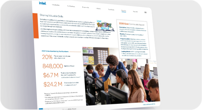 82 intel.com/responsibility 2021-22 Corporate Responsibility Report Sharing Valuable Skills We believe the skills employees bring to volunteering are as important as the time they contribute. For example, in 2021 our legal team donated over 1,500 hours, estimated to be valued at over $375,000. 1 This is particularly significant given the crit - ical community need and the cost nonprofits and schools would incur if they had to pay for the services that are delivered at no charge through our volunteers. Another employee began working with Sense International in 2019, translating content to help empower thousands of children and adults with deafblindness across India. He applied for a Intel Foundation Seed Grant to implement online training for parents, caregivers, and educators to support children with deafblindness, and is heavily involved in the operations of the cause. He has also worked to recruit and organize more than 100 Intel volunteers for the project. 2030 Goal: Community Impact Description. Deliver 10 million volunteer hours to improve our local communities, including an increase in skills-based volunteerism. Baseline. Progress measured from baseline of Jan. 1, 2020. Progress in 2021. While the pandemic continued to limit opportunities for some types of in-person volunteerism, during 2021, our employees donated 848,000 hours of service in our local communities. Included were many COVID-19-related projects that leveraged employees' technology skills and expertise. Looking Ahead. In 2022, our target is to reach 1 million volunteer hours, and to continue to expand our skills-based volunteering activities. 2021 Volunteerism by the Numbers 20% Percentage of employees who volunteered 848,000 Number of hours $6.7 M Total dollars matched by the Intel Foundation for Intel Involved volunteer hours. 2 $24.2 M Estimated in-kind value of volunteer hours. 3 1 Based on Taproot’s Pro Bono executive legal valuation rate of $195/hr. 2 Volunteer payments made in 2021 are for 2020 hours. Payments are processed once the year closes. 3 Based on the 2021 Value of Volunteer Time rate of $28.54 per hour published by Independent Sector. Introduction Our Business Responsible Inclusive Sustainable Appendix Enabling