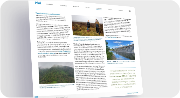 73 intel.com/responsibility 2021-22 Corporate Responsibility Report Water Conservation and Restoration Below are examples of water conservation and restoration projects Intel recently implemented or funded as part of our commitment to achieve net positive water: We implemented ultra-pure water efficiency projects in our factories by optimizing recipe flows and reducing or eliminating bypass flows. After successfully piloting these reduction projects at our Ronler Acres facility in Oregon, we are implementing similar projects at our other factory sites. Total savings of 256 million gallons were achieved during 2021. We estimate that we will save 450 million gallons in 2022, increasing to over 700 million gallons per year by 2025. During 2021, we made significant progress in the operation of our on-site water reclaim facilities. These innovative water treatment plants allow Intel to treat and reuse water within our operations in systems such as cooling towers and scrubbers, resulting in a substan - tial increase in water conservation. Our Ocotillo water recycling facility in Arizona , for example, treated and reused approximately 1.1 billion gallons of water during 2021. Wicklow Mountains National Park Blanket Bog Restoration Project – National Parks and Wildlife Service. Intel’s first water restoration project in Ireland is a pilot project that will re-wet close to 150 acres of degraded peat bog to increase water storage levels by an estimated 13 million gallons each year. These headwaters supply the Poulaphouca (Blessington) reservoir, a drinking water source for the greater Dublin area. The bog restoration will also protect biodiversity and improve carbon storage, and is likely to improve water quality. Upon completion of the pilot, the resulting data will be used to evaluate a full-scale peat bog restoration effort. Agua Tica Forest Protection – Fundecor. This project, which is expected to restore up to 46 million gallons of water per year, aims to promote water restoration through innovative forest protection schemes in Agua Tica’s action area. Agua Tica is the first public-private water fund established in Costa Rica with the purpose of improving water quality and quantity access through a green infrastructure investment portfolio. Landown - ers are compensated for the environmental services of their properties and incentivized to avoid conversion of existing forests to a more degraded condition, enabling activities such as natural and assisted regeneration, sus - tainable agricultural practices, environmental education, agroforestry systems, and reforestation. 15-Mile Reach 2021 Flow Restoration – Colorado Water Trust. This project in the Colorado River basin, which restored an estimated 226 million gallons of water in 2021, facilitates an agreement to lease water and pass additional flow downstream and through hydropower turbines to enhance flows in the 15-Mile Reach. The leased flows support fish and wildlife, and also benefit conditions upstream on the Fryingpan and Roaring Fork Rivers. As a further benefit, this flow is used by a hydroelectric power plant. For more information on these and other projects, visit our Water Restoration website. Through conservation and Intel- enabled restoration projects, we have achieved 99% (by volumne) toward our net positive water globally, including net positive water in three countries: the US, India, and Costa Rica. Intel and the National Parks and Wildlife Service launched a blanket bog restoration project in the Wicklow Mountains National Park. This is Intel’s first water restoration project in Ireland. 15-Mile Reach 2021 Flow Restoration in the Colorado River watershed, supporting Arizona’s water resources. An Intel-supported project aims to promote water restoration in Costa Rica through innovative forest protection schemes. Introduction Our Business Responsible Inclusive Sustainable Enabling Appendix