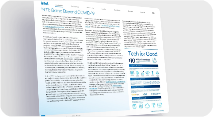 Our Business Responsible Inclusive Sustainable Enabling Appendix 6 intel.com/responsibility 2021-22 Corporate Responsibility Report Introduction IRTI: Going Beyond COVID-19 We are extremely proud of how our team has responded throughout the COVID-19 pandemic. We have made changes and adopted measures to continue providing a safe environment for our employees and the operation of our manufacturing sites, and worked to mitigate risks to workers in our supply chain . Intel, the Intel Foundation, and Intel subsidiaries have donated $10 million to support local communities, including matching of employee and retiree donations. In 2020, we launched our Pandemic Response Technology Initiative (PRTI), a $50 million commitment to support essential workers, hard-hit businesses, and students of all ages with Intel-funded technology projects. Through PRTI, Intel partnered with more than 170 organizations on over 230 projects in multiple sectors. In 2021, we expanded the scope of the PRTI to include additional program areas, and renamed it the Intel RISE Technology Initiative (IRTI). With IRTI we are building deeper relationships with our customers and other partners in line with our corporate purpose and goal to create shared value. Since then, the IRTI has created a broader, purpose-driven platform for action with new dedicated workstreams for social equity and human rights, accessibility, and climate action. Among the many lessons learned over the past two years, is that technology is essential. In the IRTI’s first year, we invested $9.5 million to fund 63 projects across six areas that align with the Intel RISE pillars: accessibility; economic recovery; education; health and life sciences; social equity and human rights; and sustainability and climate. Intel differentiated technology was utilized in 67% of the projects to solve unique challenges that plague individuals and organiza - tions globally. Intel experts drive the success of IRTI projects, and we work with partners to identify issues and provide unique technology solutions to some of the world’s most complex challenges. Some of the most compelling projects funded by IRTI support diverse communities and strengthen our goal to support social equity and innovation. Intel has earmarked an additional $10 million for IRTI in 2022. Below are examples of IRTI projects. For more, see “ Collaborating for Technology Impact ” in the Enabling section of this report. Economic Recovery: Upskilling Program Supports Sports, Entertainment Workers. As we emerge from the pandemic, we’re faced with millions of workers who lost their jobs looking for new opportunities, including 9.3 million people in the sports and entertainment industries. We partnered with Microsoft and the Innovation Institute for Fan Experience to launch a joint initiative to address the skills gap and provide workers with a path for upward professional mobility. This program provides access to online curated content to help workers increase their competency, grow their professional skills, and enhance their capabilities for current and future roles. Ensuring an inclusive economic recovery requires opportunities for those hit hardest by job losses to develop essential skills. Health and Life Sciences: Integrating AI in Healthcare and Help Improve Patient Safety. Through IRTI, we’re implementing Intel technology to help improve patient safety and care. One project leverages Intel AI technology to establish zones around a patient’s bed, implementing virtual rails that, if crossed, trigger an alert for the medical team. A trained technician also monitors multiple patient rooms from a central station with this AI-assisted tech and alerts the care team to help prevent falls in the hospital setting. Built with Intel® OpenVINO™ technology to ensure enhanced performance on Intel AI hardware, the solution has been deployed at Intermountain Healthcare . We will continue to uncover and address both patient and provider needs and optimize Intel technology to maximize our potential impact within the medical industry. Sustainability and Climate: Establishing a Solar Community Hub in Brazil. To address environmental and educational needs of the Boa Esperança community in Brazil, we partnered with Dell and the Sustainable Amazon Foundation to establish a solar community hub. The solar-powered hub provides Internet access, technology, and services that benefit about 1,500 people. Included is access to digital literacy skills, business management training, and healthcare through telehealth connections. Also included is the Amazon Deforestation Alert System, which combines Inputs from local envi - ronmental monitors with AI technology to identify and predict occurrences of deforestation or environmental degradation in the Amazon region.
