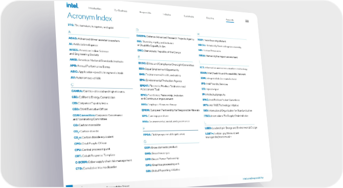 100 intel.com/responsibility 2021-22 Corporate Responsibility Report Acronym Index 3TG: Tin, tantalum, tungsten, and gold A ADAS: Advanced driver-assistance system AI: Artificial intelligence AISES: American Indian Science and Engineering Society ANSI: American National Standards Institute APB: Annual Performance Bonus ASIC: Application-specific integrated circuit AV : Autonomous vehicle C CAHRA: Conflict-affected and high-risk area CEC: California Energy Commission CEI: Corporate Equality Index CEO: Chief Executive Officer CGN Committee: Corporate Governance and Nominating Committee CO: Carbon monoxide CO 2 : Carbon dioxide CO 2 e: Carbon dioxide equivalent CPO: Chief People Officer CPU: Central processing unit CRT: Cobalt Response Template C-SCRM: Cyber supply chain risk management CTD: Cumulative trauma disorder D DARPA: Defense Advanced Research Projects Agency DEI: Diversity, equity, and inclusion or Disability Equality Index DRC: Democratic Republic of the Congo E ECOC: Ethics and Compliance Oversight Committee EEO: Equal Employment Opportunity EHS: Environmental, health, and safety EPA: Environmental Protection Agency EPEAT: Electronic Product Environmental Assessment Tool EPIC: Excellence, Partnership, Inclusion, and Continuous Improvement ERG: Employee Resource Group EPRM: European Partnership for Responsible Minerals EPS: Earnings per share ESG: Environmental, social, and governance F FPGA: Field-programmable gate array G GDP: Gross domestic product GHG: Greenhouse gas GPP: Green Power Partnership GPU: Graphics processing unit GRI: Global Reporting Initiative H HAP: Hazardous air pollutant HBCU: Historically Black college or university HR: Human Resources HRIA: Human rights impact assessment I ICT: Information and communications technology IDAN: Intel Disability and Accessibility Network IDM: Integrated device manufacturer IFS: Intel Foundry Services I/O: Input/output IP: Intellectual property IPAC: Intel Political Action Committee IRTI: Intel RISE Technology Initiative ISO: International Organization for Standardization iTSCi: International Tin Supply Chain Initiative L LEED: Leadership in Energy and Environmental Design LGBT+: Lesbian, gay, bisexual, and transgender/transsexual + Introduction Our Business Responsible Inclusive Sustainable Enabling Appendix