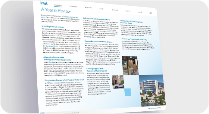 Our Business Responsible Inclusive Sustainable Enabling Appendix 5 intel.com/responsibility 2021-22 Corporate Responsibility Report Introduction A Year in Review In May 2020, we laid out our 2030 RISE strategy and goals . Since then, we have made considerable progress on those goals. Below are some highlights from 2021 and early 2022: Investing in New Factories We announced significant manufacturing expansion plans, including the construction of two additional chip factories at our Arizona site, two more at a new Intel site in Ohio, and expansions in New Mexico, Oregon, and Malaysia. We estimate that our investments at each of the Ohio and Arizona sites will be $20 billion. We also announced plans to invest up to 80 billion euros to advance a world-class semiconductor ecosystem in the European Union . The European investment will include a new fab mega-site in Germany; an R&D hub in France; and R&D, manufacturing, and foundry services in Ireland, Italy, Poland, and Spain. Advancing Responsible Mobility and Automotive Safety Intel’s Mobileye technology has moved advanced driver- assistance systems from luxury add-on to standard equipment, and now helps keep drivers and passengers of more than 100 million vehicles safer. In December 2021, Intel announced its intention to take Mobileye public in the US in mid-2022 via an initial public offering of newly issued Mobileye stock. Progressing Toward a Net Positive Water Goal In 2021, we conserved 9.3 billion gallons of water internally and enabled restoration of approximately 2.3 billion gallons through investments in watershed restoration projects. These achievements advanced us toward our goal of net positive use, resulting in 99% (by volume) of global fresh water treated and returned to communities or the environment and restored through watershed projects during 2021. Through the end of 2021, we have achieved net positive water in three countries: the US, India, and Costa Rica. Building a More Inclusive Workforce In 2021, we continued our focus on career development and progression of diverse talent, and saw absolute numbers increase in all categories. Some of the numbers from 2020 to 2021 did not increase much as percentages or—in some cases—decreased, because of Intel’s unprecedented growth. We surpassed our milestone goal of reaching 1,375 women in senior leadership roles by 74, ending the year with 1,449 women in senior leadership roles across the globe. Responding to Humanitarian Crises When humanitarian crises or natural disasters strike, the Intel Foundation matches employees’ donations to support affected communities. In 2021, 16 relief campaigns raised nearly $2 million in donations and matches to aid recovery across 13 countries affected by wildfires, floods, winter storms, tornadoes, earthquakes, hurricanes, COVID-19, and more. More recently, the Foundation launched an employee donation campaign in response to the humanitarian crisis in Ukraine. Together, the Foundation and Intel employees raised over $2 million to support Ukraine aid efforts. Leading Supply Chain Responsibility and Impact As a result of our efforts to ensure the protection of human rights in the work place, our suppliers have returned $25 million in fees to their workers since 2014. In 2021, our progress also included expansion of our work in responsible minerals sourcing, and the achievement of $1.4 billion in annual spending with diverse-owned suppliers—a 10-fold increase compared to 2015. Contributing 848,000 Employee Volunteer Hours While the pandemic limited in-person gatherings, we continued to offer virtual volunteer opportunities for employees to give their time and talent to those in need. In 2021, our employees reported more than 848,000 volunteer hours globally in support of schools and non - profit organizations in our communities. Becoming a “Hybrid-First” Company Intel announced plans to become a “hybrid-first” company, allowing the majority of employees to split their time between working remotely and in the office. We also increased our employee compensation budget by about $1 billion in pay and $1.4 billion in stock.