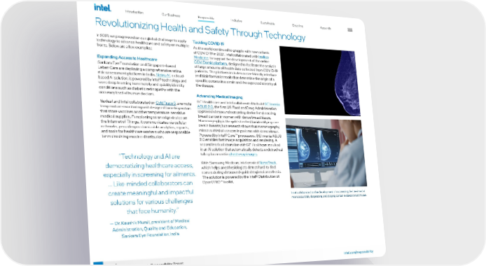 45 2021-22 Corporate Responsibility Report Revolutionizing Health and Safety Through Technology In 2021, we progressed on our global challenge to apply technology to advance healthcare and safety on multiple fronts. Below are a few examples: Expanding Access to Healthcare Sankara Eye Foundation and Singapore-based Leben Care are deploying a comprehensive retina risk-assessment platform in India. Netra.AI , a cloud- based AI solution, is powered by Intel® technology and uses deep learning to remotely and quickly identify conditions such as diabetic retinopathy with the accuracy level of human doctors. Nexleaf and Intel collaborated on ColdTrace 5 , a remote temperature-monitoring unit designed for refrigerators that store vaccines or other temperature-sensitive medical supplies. Functioning as an edge device on the Internet of Things, it communicates via cellular networks, providing customizable analytics, reports, and tools for healthcare workers who are responsible for maintaining vaccine distribution. “Technology and AI are democratizing healthcare access, especially in screening for ailments. ... Like-minded collaborators can create meaningful and impactful solutions for various challenges that face humanity.” — Dr. Kaushik Murali, president of Medical Administration, Quality and Education, Sankara Eye Foundation India Tackling COVID-19 As the world continued to grapple with new variants of COVID-19 in 2021, Intel collaborated with Insilico Medicine , to support the development of the online COVIDomic platform , designed to facilitate the analysis of large amounts of health data collected from COVID-19 patients. The platform includes a user-friendly interface and bioinformatics tools that determine the origin of a specific coronavirus strain and the expected severity of the disease. Advancing Medical Imaging GE Healthcare and Intel collaborated to build GE Invenia ABUS 2.0 , the first US Food and Drug Administration- approved ultrasound screening device for detecting breast cancer in women with dense breast tissue. Mammography is the gold standard for identifying can - cers in breasts, but research shows that mammography misses a third of cancers in patients with dense tissue. Powered by Intel® Core™ processors, GE Invenia ABUS 2.0 enables fast image acquisition and rendering. A second Intel collaboration with GE Healthcare resulted in an AI solution that automatically detects endotracheal tube placement in chest x-ray images . With Samsung-Medison, Intel created NerveTrack , which helps anesthesiologists detect hard-to-find nerves during ultrasound-guided regional anesthesia. The solution is powered by the Intel® Distribution of OpenVINO™ toolkit. Intel collaborated on the development of a screening device aimed at more accurately diagnosing and staging cancer in dense breast tissue. Introduction Our Business Inclusive Sustainable Enabling Appendix Responsible intel.com/responsibility