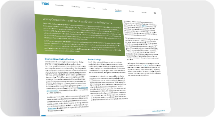 67 intel.com/responsibility 2021-22 Corporate Responsibility Report Smart and Green Building Practices Our engineers have long incorporated green design into the new construction and renovation of our facilities, which helps us achieve efficiencies in energy consumption, water use, and recycling. We also partner with companies and nonprofits to expand the number of manufacturers implementing green building practices. We have achieved LEED® green building certification for more than 17.9 million square feet of space in 50 buildings. Our new factories and office buildings incor - porate many heat recovery and water conservation and recovery technologies. Currently Intel has several new buildings and site expansions going through the LEED certification process. As part of our recent net zero GHG announcement , we committed to build our new factories to LEED standards. Intel also partners with a robust ecosystem of equipment manufacturers and systems integrators to deliver a new generation of smart building solutions built on interop - erable, secure, and scalable Internet of Things technolo - gies and advanced data analytics—at the network edge. Read more about smart buildings with Intel® Internet of Things technologies. Product Ecology Intel’s vision is to avoid the use of substances in our products that could harm the environment or human health, and to ensure that we act responsibly and with caution. Intel product material restrictions are based on consideration for legal requirements, international trea - ties and conventions, and specific market requirements. For more than a decade, we have collaborated with suppliers and customers to work toward eliminating hazardous substances such as lead and halogenated flame retardants from our products. While legislation does not require the elimination of halogenated flame retardants in all electronic components, Intel has played a role in facilitating industry consensus around low-halogen practices. We engage with industry com - mittees on the development of materials declaration, test methods, and eco-design standards. Intel leads several global environmental regulations influencing and harmonization efforts within multiple industry trade associations. We also meet the requirements of the European Union’s Registration, Evaluation, Authorization, and Restriction of Chemicals ( REACH ) regulation and comply with applicable product ecology regulations. When hazardous substances are included within our products, we take steps to ensure that they are handled safely from the time they enter our operations until they are properly disposed of or recycled. Managing electronic waste (e-waste) such as computers, monitors, and phones is a global concern. Most of our products—including motherboards, microprocessors, and other components—fall within the scope of e-waste laws when they are incorporated into a final product, generally by an original equipment manufacturer (OEM). As such, we work with OEMs, retailers, customers, and others to identify shared solutions for used electronics. We also take steps to integrate environmen - tal considerations into the design of our products to minimize environmental impacts of electronics at their end of life. Intel supports the development of green procurement standards and tools such as EPEAT and other eco-design directives. These eco-design standards, directives, and tools are designed to help purchasers in the public and private sectors evaluate, compare, and select electronic products based on environmental leadership and corpo - rate social responsibility attributes. Linking Compensation and Financing to Environmental Performance Since 2008, we have linked a portion of executive and employee compensation to corporate responsibility factors. Our 2021 bonus incorporated environmental-related metrics aligned to our 2030 goals, including conserving more than 7.5 billion gallons of water in our operations, restoring more than 1.5 billion gallons of water to our local watersheds, and conserving 125 million kWh of energy. We exceeded each of the targets, conserving 9.3 billion gallons and restoring 2.3 billion gallons of water, and conserving 162 million kWh of energy globally. In 2022, environmental metrics include achieving 90% renewable electricity globally, conserving 8.5 billion gallons of water in our operations, and restoring 2.5 billion gallons of water to local watersheds. For more information, see our 2022 Proxy Statement . In 2021, we also integrated sustainability metrics into our financing activities for the first time. We entered into a $5 billion, five-year variable-rate revolving credit facility which, if drawn, is expected to be used for general corporate purposes. The interest rate is subject to adjustment if we achieve, or fail to achieve, certain annual energy and water conservation targets established to maintain our progress toward our 2030 corporate responsibility goals on energy and water. In 2021, for the second consecutive year, we achieved these targets. Introduction Our Business Responsible Inclusive Sustainable Enabling Appendix