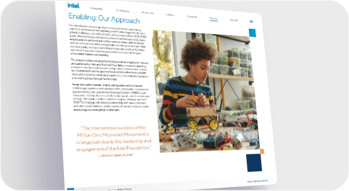 80 intel.com/responsibility 2021-22 Corporate Responsibility Report Enabling: Our Approach Our employees are our greatest asset, and their engineering expertise and passion for applying Intel® technology to help solve global challenges are critical to the achievement of our 2030 RISE goals. We have long cultivated a culture that strongly encourages employees to get involved in their communities, with 10 million volunteer hours contributed globally over the past decade. With our new goals, we have committed to donate another 10 million volunteer hours the next decade and to increase the impact of our skills-based volunteering. To catalyze action and amplify the impact of our employees’ service and generosity, Intel and the Intel Foundation invest in matching programs and innovative partnerships and collaborations. In turn, our investments and support of local communities help us build trust with external stakeholders and realize our corporate purpose of enriching lives through technology. As an innovation leader, Intel is well-positioned to share its technology expertise and solutions with communities, customers, governments, non-governmental organizations (NGOs), and educators to help them reach their own goals and effect broader change. We aspire to drive collective impact through our Intel RISE Technology Initiative in partnership with our customers and other stakeholders, and to explore innovative ways to apply technology to solve global challenges. “The tremendous success of the Million Girls Moonshot Movement is in large part due to the leadership and engagement of the Intel Foundation.” — STEM Next Opportunity Fund Introduction Our Business Responsible Inclusive Sustainable Appendix Enabling