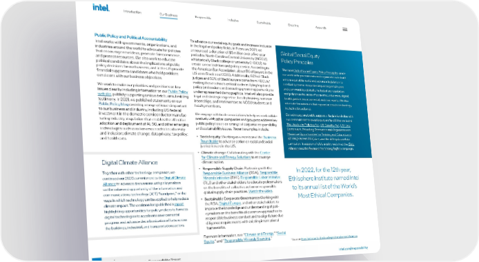 26 intel.com/responsibility 2021-22 Corporate Responsibility Report Public Policy and Political Accountability Intel works with governments, organizations, and industries around the world to advocate for policies that encourage new ideas, promote fair commerce, and protect resources. We also work to educate political candidates about the implications of public policy decisions for our business, and in the US provide financial support to candidates who hold positions consistent with our business objectives. We work to make our priorities and positions on key issues clear by including information on our Public Policy website , publicly supporting amicus briefs, or submitting testimony. In 2021, we published statements on our Public Policy blog covering a range of issues important to our business and industry, including US federal investment in the domestic semiconductor manufac - turing industry; regulation that enables the effective adoption and deployment of AI, 5G, and other emerging technologies such as autonomous vehicles; diversity and inclusion; climate change; data privacy; tax policy; and healthcare. Global Social Equity Policy Principles The Intel Global Social Equity Policy Principles guide our work with governments and organizations to build a more equitable world and advance legislation to combat systemic inequities impacting employees and communities globally. Included are regulation and policies in the areas of economic, education, digital, health, justice, environmental, and civic equity. We also advocate for initiatives that expand access to technology , including broadband. Our advocacy and public support of legislation in line with our commitment to social equity in the US has included The Justice in Policing Act , US Equality Act , US Hate Crimes Act , Providing Resources and Organization to Maximize Opportunities for Training and Education in STEM (PROMOTES) Act , and the #StopAsianHate campaign. In support of civic equity, we joined the Civic Alliance and the Business for Voting Rights campaign. To advance our social equity goals and increase inclusion in the legal and policy fields, in February 2021, we announced a donation of $5 million over a five-year period to North Carolina Central University (NCCU), a historically Black college or university (HBCU), to create a new tech law and policy center. According to the American Bar Association, about 5% of lawyers in the US were Black as of 2020. Additionally, 80% of Black judges and 50% of Black lawyers come from HBCUs, 1 making these schools critical to diversifying legal and policy professions and ensuring greater opportunity to underrepresented demographics. Intel will also provide legal and strategic expertise, faculty training, summer internships, and Intel mentors to NCCU students and faculty members. We engage with trade associations to help us work collab - oratively with other companies and groups to address key public policy issues on a range of corporate responsibility and sustainability issues. Recent examples include: • Social equity: Working as a member of the Business Roundtable to advance action on racial and social justice issues in the US. • Climate change: Collaborating with the Center for Climate and Energy Solutions to encourage climate action. • Responsible Supply Chain: Partnering with the Responsible Business Alliance (RBA), Responsible Minerals Initiative (RMI), Responsible Labor Initiative (RLI) and other stakeholders to educate policymakers on the benefits of collective action on responsible global supply chain practices. Watch the video . • Sustainable Corporate Governance: Working with the RBA, Digital Europe , and other stakeholders to improve the knowledge and understanding of poli - cymakers on the benefits of common approaches to responsible business conduct and to align future due diligence requirements with existing international frameworks. For more information, see “ Climate and Energy ,” “ Social Equity ,” and “ Responsible Minerals Sourcing .” In 2022, for the 12th year, Ethisphere Institute named Intel to its annual list of the World’s Most Ethical Companies. Digital Climate Alliance Together with other technology companies, we continued our 2020 commitment to the Digital Climate Alliance to advance discussions with policymakers on the value and opportunity of the information and communications technology (ICT) “handprint,” or the ways in which technology can be applied to help reduce climate impact. The coalition has published a report highlighting opportunities for policymakers to harness digital technologies to accelerate environmental progress and advance decarbonization efforts across the buildings, industrial, and transportation sectors. 1 Source: How historically black colleges transformed America . Introduction Responsible Inclusive Sustainable Enabling Appendix Our Business