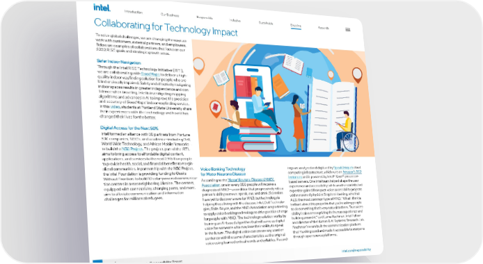 85 intel.com/responsibility 2021-22 Corporate Responsibility Report Collaborating for Technology Impact To solve global challenges, we are changing the ways we work with customers, external partners, and employees. Below are examples of collaborations that focus on our 2030 RISE goals and strategic growth areas. Safer Indoor Navigation Through the Intel RISE Technology Initiative (IRTI), we are collaborating with GoodMaps to deliver a high- quality indoor wayfinding solution for people who are blind or visually impaired. Safely and effectively navigating indoor spaces results in greater independence and con - fidence when traveling. Intel is investigating mapping algorithms and advances in AI to improve the precision and accuracy of GoodMaps’ indoor wayfinding service. In this video , students at Portland State University share their experiences with the technology and how it has changed their lives for the better. Digital Access for the Next 50% Intel formed an alliance with 50 partners from Fortune 500 companies, NGOs, and academia—including Dell, World Wide Technology, and African Mobile Networks— to build the N50 Project . The project, part of the IRTI, aims to bring access to affordable digital content, applications, and services to the next 3.9 billion people to provide health, social, and financial benefits to margin - alized communities. In partnership with the N50 Project, the Intel Foundation is providing funding to Geeks Without Frontiers to build 10 solar-powered communica - tion centers in areas neighboring Ukraine. The centers, equipped with connectivity, charging ports, and more, aim to alleviate communication and information challenges for millions of refugees. Voice Banking Technology for Motor Neurone Disease According to the Motor Neurone Disease (MND) Association , one in every 300 people will receive a diagnosis of MND—a condition that progressively robs a person’s ability to move, speak, eat, and drink. Scientists have yet to discover a cure for MND, but technology is helping those living with the disease. Intel, Dell Technolo - gies, Rolls-Royce, and the MND Association are partnering to apply voice banking technology to drive positive change for people with MND. The technology solution works by training an AI-based algorithm that will serve as digital voice for someone who may lose their ability to speak in the future. The digital voice can create any word or sentence with the same characteristics as the original voice using learned critical words and syllables. Record - ings are analyzed and digitized by SpeakUnique’s cloud computing infrastructure, which runs on Amazon’s EC2 instances and is powered by Intel® Xeon® processor- based servers. One Intel team helped shape the user experience and accessibility, while another contributed expertise gained from past voice accessibility projects with renowned physicist Stephen Hawking, who had ALS, the most common type of MND. “What I think is brilliant about this project is that you're asking people to do something that’s very natural to them. True acces - sibility is about recognizing the human experience and building around it,” said Lama Nachman, Intel Fellow and director of the Human & AI Systems Research Lab. Nachman’s team built the communication platform that Hawking used and made it accessible to everyone through open-source platforms. Introduction Our Business Responsible Inclusive Sustainable Appendix Enabling