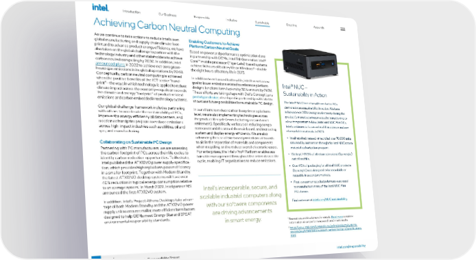 77 intel.com/responsibility 2021-22 Corporate Responsibility Report Achieving Carbon Neutral Computing As we continue to take actions to reduce Intel’s own global manufacturing and supply chain climate foot - print and to advance product energy efficiency, we have also taken on the global challenge to partner with the technology industry and other stakeholders to achieve carbon neutral computing by 2030. In addition, Intel announced plans in 2022 to achieve net-zero green - house gas emissions in its global operations by 2040. Conceptually, carbon neutral computing is achieved when the positive benefits of the ICT sector “hand - print”—the ways in which technology is applied to reduce climate impact across the economy—equals or exceeds the climate and energy “footprint” of product-related emissions and carbon embedded in technology systems. Our global challenge framework includes partnering with others to accelerate the sustainability of PCs, improve the energy efficiency of data centers, and accelerate handprint projects to reduce emissions across high-impact industries such as utilities, oil and gas, and manufacturing. Collaborating on Sustainable PC Design Partnering with PC manufacturers, we are assessing the carbon footprint of PCs across their life cycles to identify carbon reduction opportunities. To illustrate, Intel published the ATX12VO power supply specifica - tion, which provides higher platform power efficiency in a smaller footprint. Together with Modern Standby, the latest ATX12VO desktop systems will have over 40% reduction in typical energy consumption relative to an average system. 1 In March 2022, Intel partner MSI announced the first ATX12VO system. In addition, Intel’s Project Athena Desktops take advan - tage of both Modern Standby and the ATX12VO power supply unit to ensure smaller, more efficient form factors designed to help OEMs meet Energy Star and EPEAT environmental responsibility standards. Enabling Customers to Achieve Platform Carbon Neutral Goals Based on power and performance optimization done in partnership with OEMs, Intel 11th Generation Intel® Core™ mobile processor (Tiger Lake)-based systems achieve 16 hours of battery life on Windows 2 —double the eight hours of battery life in 2015. In addition to enhanced battery life, Intel has set a new goal to lower emissions related to reference platform designs for client form factors by 30% or more by 2030. These efforts are taking shape with Dell’s Concept Luna prototype device , developed in partnership with Intel to showcase future possibilities for sustainable PC design. In our efforts to reduce carbon footprint at a platform level, we are also implementing technologies across the product life cycle (manufacturing, use, and asset retirement). Specifically, we focus on reducing compo - nent count and the area of the main board, and increasing system and display energy efficiency. We are also advancing the use of bio-based printed circuit boards to aid in the separation of materials and components when recycling, and to reduce overall electronic waste. For enterprises, the Intel vPro® Platform enables sus - tainable management throughout the entire device life cycle, enabling IT organizations to reduce emissions. Intel® NUC – Sustainability in Action The Intel® NUC line of small form-factor PCs demonstrates sustainability in action. We have achieved over 25% savings in electricity during the product's manufacturing process by transitioning to a low-temperature solder. With Intel NUC Mini PCs, Intel continues to focus on landfill avoidance and use of recyclable materials. In 2021: • Intel repaired, reused, or recycled over 70,000 units returned by customers through the Intel NUC return material authorization program. • We kept >99.5% of all returned material (by weight) out of landfills. • Over 95% of packaging for all Intel NUC products (by weight) was designed to be recyclable or reusable in secondary markets. • Post-consumer recycled polymers were used to manufacture many of the Intel NUC Mini PC chassis. Find out more at intel.com/NUCsustainability . Intel’s interoperable, secure, and scalable industrial computers along with our software components are driving advancements in smart energy. 2 https://www.intel.com/content/www/us/en/products/systems- devices/sku/h91417889/microsoft-surface-laptop-4/specifications. html 1 See notices and disclaimers for details. Read more complete information about performance and benchmark results. Introduction Our Business Responsible Inclusive Sustainable Enabling Appendix