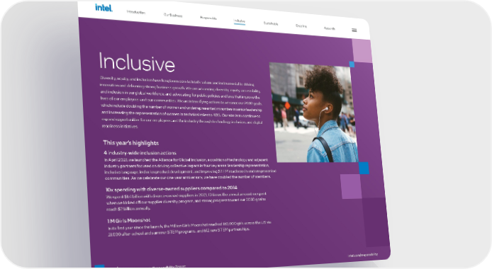 47 intel.com/responsibility 2021-22 Corporate Responsibility Report Inclusive Diversity, equity, and inclusion have long been core to Intel’s values and instrumental to driving innovation and delivering strong business growth. We are advancing diversity, equity, accessibility, and inclusion in our global workforce, and advocating for public policies and laws that improve the lives of our employees and our communities. We are intensifying actions to advance our 2030 goals, which include doubling the number of women and underrepresented minorities in senior leadership and increasing the representation of women in technical roles to 40%. Our aim is to continue to expand opportunities for our employees and the industry through technology, inclusion, and digital readiness initiatives. This year’s highlights 4 industry-wide inclusion actions In April 2021, we launched the Alliance for Global Inclusion, a coalition of technology and adjacent industry partners focused on driving collective impact in four key areas: leadership representation, inclusive language, inclusive product development, and improving STEM readiness in underrepresented communities. As we celebrate our one-year anniversary, we have doubled the number of members. 10x spending with diverse-owned suppliers compared to 2014 We spent $1.4 billion with diverse-owned suppliers in 2021, 10 times the annual amount we spent when we kicked off our supplier diversity program, and strong progress toward our 2030 goal to reach $2 billion annually. 1 M Girls Moonshot In its first year since the launch, the Million Girls Moonshot reached 160,000 girls across the US via 21,000 after-school and summer STEM programs, and 612 new STEM partnerships. Introduction Our Business Responsible Sustainable Enabling Appendix Introduction Our Business Responsible Sustainable Enabling Appendix Inclusive Inclusive