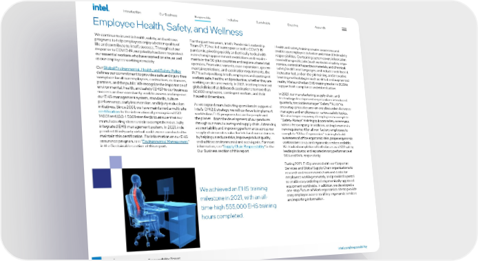 37 2021-22 Corporate Responsibility Report Employee Health, Safety, and Wellness We continue to invest in health, safety, and wellness programs to help employees enjoy a better quality of life and contribute to Intel’s success. Throughout our response to COVID-19, our priority has been to protect our essential workers who have worked on site, as well as our employees working remotely. Our Global Environmental, Health, and Safety Policy defines our commitment to provide a safe and injury-free workplace for all our employees, contractors, customers, partners, and the public. We recognize the importance of environmental, health, and safety (EHS) to our business success and we constantly work to assess and improve our EHS management system, standards, culture performance, early intervention, and injury-reduction initiatives. Since 2001, we have maintained a multi-site certification to the internationally recognized ISO 14001 and ISO 45001 standards to ensure that our manufacturing sites sustain a comprehensive, fully integrated EHS management system. In 2021, inde - pendent third-party virtual audits were conducted to maintain this certification. For information on our EHS assurance program, see “ Environmental Management ” in the Sustainable section of this report. For the past two years, Intel’s Pandemic Leadership Team (PLT) has led our response to the COVID-19 pandemic, pivoting quickly and ethically to deal with ever-changing government restrictions and require - ments in the 50-plus countries and regions where Intel operates. From virus variants, case expansions, govern - mental restrictions, and vaccination requirements, the PLT has helped keep Intel's employees and contingent workers safe, healthy, and productive, whether they are working on site or remotely. In 2021, Intel implemented global clinics that delivered vaccinations to more than 60,000 employees, contingent workers, and their household members. As we expand manufacturing operations in support of Intel’s IDM 2.0 strategy, we will continue to implement world-class EHS programs to care for people and the planet—from the development of our products through our manufacturing and supply chain. Advancing accountability and improving performance across our supply chain creates value for Intel and our customers by helping us reduce risks, improve product quality, and achieve environmental and social goals. For more information, see “ Supply Chain Responsibility ” in the Our Business section of this report. Health and safety training creates awareness and enables our employees to better understand their safety responsibilities. Our training system covers information needed for specific jobs (such as electrical safety, ergo - nomics, control of hazardous materials, and chemical safety) in different languages, and includes web-based, instructor-led, and on-the-job training, and innovative learning methodologies such as virtual and augmented reality. We launched an EHS training tracker in 2021 to support both compliance and risk reduction. In 2021, our manufacturing, supply chain, and technology development organizations introduced quarterly, trackable manager “Safety TALKs“ to encourage proactive one-on-one discussions between managers and employees on various safety topics. We also began requiring all employees to complete “Safety Always“ training to boost safety awareness across the company. In addition, we implemented a new requirement for all non-factory employees to complete “Office Ergonomics“ training to build awareness of office ergonomic risks, proper ergonomic workstation set-up, and ergonomic services available. We tracked completion of both classes as a 2021 safety leading indicator, and reported strong performance at 98% and 94%, respectively. During 2021, EHS partnered with our Corporate Services and Global Supply Chain organizations to research and recommend chairs and desks for employees working remotely, and provided a portal to enable easy ordering of ergonomically approved equipment worldwide. In addition, we developed a one-stop Future of Work ergonomics site to provide easy employee access to all key ergonomic services and reporting information. We achieved an EHS training milestone in 2021, with an all- time-high 555,000 EHS training hours completed. Introduction Our Business Inclusive Sustainable Enabling Appendix Responsible intel.com/responsibility