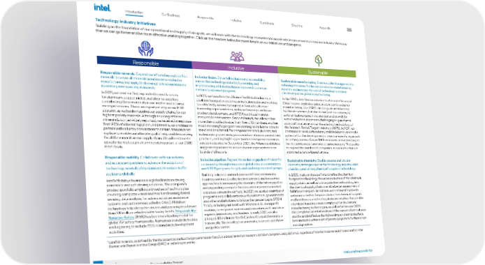 Our Business Responsible Inclusive Sustainable Enabling Appendix 9 intel.com/responsibility 2021-22 Corporate Responsibility Report Introduction Technology Industry Initiatives Building on the foundation of our operational and supply chain goals, we will work with the technology ecosystem to accelerate improvements across our industry. We know that we can go faster and be more effective working together. Click on the headers below for more details on our initiatives and progress. Responsible Inclusive Sustainable Responsible minerals. Expand our efforts beyond conflict minerals 1 to cover all minerals used in semiconductor manufacturing and apply the learnings to lead our industry in creating new sourcing standards. In 2021, we sent our first expanded minerals survey for aluminum, copper, nickel, and silver to suppliers contributing these materials in our Intel-manufactured microprocessors. This is an important step in our RISE strategy, as we begin mapping our supply chains for our highest priority minerals. Although sourcing of these minerals is not yet widely reported, we received a response from 89% of relevant suppliers. Additionally, we continue to partner with industry associations to ensure standards are in place to enable our ultimate goal of responsible sourcing for all the minerals in our supply chain. We will continue to identify the highest priority minerals in pursuit of our 2030 RISE Goals. Responsible mobility. Collaborate with our industry and ecosystem partners to advance the adoption of technology-neutral safety standards to reduce traffic accidents globally. Intel’s Mobileye business is a global leader in driving assistance and self-driving solutions. The company’s product portfolio employs a broad set of technologies covering computer vision and machine learning-based sensing, data analysis, for advanced driver assistance systems and autonomous vehicles (AVs). Mobileye technology helps keep the drivers and passengers of more than 100 million vehicles safer today. Intel’s Responsibility- Sensitive Safety (RSS) has become a leading model for global AV safety frameworks. Numerous standards bodies are beginning to include RSS in standards development activities. Inclusion Index. Drive full inclusion and accessibility across the technology industry by creating and implementing a Global Inclusion Index with common metrics to advance progress. In 2021, we launched the Alliance for Global Inclusion, a coalition focused on creating an inclusion index and working to collectively advance progress in four critical areas: leadership representation, inclusive language, inclusive product development, and STEM readiness in under- resourced communities. Since its launch, the Alliance has more than doubled in size, from five to 12 members, and has made meaningful progress on creating an Inclusion Index to serve as a benchmark for companies to track diversity and inclusion improvements, provide information on current best practices, and highlight opportunities to improve outcomes across industries. In December 2021, the Alliance published suggested guidance to secure diverse representation on boards of directors. Inclusive pipeline. Expand the inclusive pipeline of talent for our industry through innovative global education initiatives and STEM programs for girls and underrepresented groups. Building a diverse and inclusive workforce and industry requires continued collective investments and innovative approaches to increasing the diversity of the talent pipeline and expanding access to the education resources needed to pursue careers in our field. In 2021, we scaled a number of programs and collaborations with customers, governments, and other stakeholders to bridge the gender gap in STEM fields, including our work with Women in AI, a nonprofit working to empower women and minorities as AI and data experts, innovators, and leaders. In early 2021, we also pledged $5 million to North Carolina Central University, a historically Black college or university, to create a tech law and policy center. Sustainable manufacturing . Create a collective approach to reducing emissions for the semiconductor manufacturing industry and increase the use of technology to reduce climate impact in global manufacturing. In the 1990s, Intel led an initiative to eliminate the use of Class 1 ozone-depleting substances in semiconductor manufacturing. Our 2030 climate goals are informed by climate science, but due to our (and our industry’s) early emissions reductions and demand growth for semiconductors, it remains challenging to gain formal approval for a target under the existing methodology of the Science-Based Targets Initiative (SBTi). In 2021, we continued to work with industry stakeholders to assess the potential for the development of a sector-specific approach to setting science-based GHG emissions-reduction targets for the semiconductor manufacturing industry. The goal is to expand the number of companies in our sector that set approved science-based targets. Sustainable chemistry. Enable greener and circular chemistry strategies across the technology industry value chain by transforming chemical footprint methodology. In 2021, Intel continued efforts to refine the chemical footprint methodology for use in evaluation of the chemical supply chain, as well as to integrate the methodology into the chemical supply chain to enable better assessment of full lifecycle impact. In addition, we continued to provide webinars to further the promotion of the chemical footprint methodology as a technology industry initiative. Sustainable chemistry baselines were completed for the current manufacturing technologies, as well as for the year 2020. We completed an initial analysis of the current chemical uses and those identified as the highest impact chemistries have been included within a set of priority projects to further scope and disposition. 1 Conflict minerals, as defined by the US Securities and Exchan