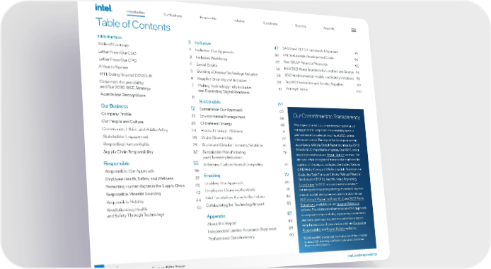 Our Business Responsible Inclusive Sustainable Enabling Appendix 2 intel.com/responsibility 2021-22 Corporate Responsibility Report Introduction Table of Contents Introduction 2 Table of Contents 2 Letter From Our CEO 3 Letter From Our CPO 4 A Year in Review 5 IRTI: Going Beyond COVID-19 6 Corporate Responsibility 7 and Our 2030 RISE Strategy Awards and Recognitions 11 Our Business 12 Company Profile 13 Our People and Culture 20 Governance, Ethics, and Public Policy 24 Stakeholder Engagement 28 Respecting Human Rights 29 Supply Chain Responsibility 32 Responsible 35 Responsible: Our Approach 36 Employee Health, Safety, and Wellness 37 Protecting Human Rights in the Supply Chain 40 Responsible Minerals Sourcing 42 Responsible Mobility 44 Revolutionizing Health 45 and Safety Through Technology Inclusive 47 Inclusive: Our Approach 48 Inclusive Workforce 49 Social Equity 56 Building a Diverse Technology Industry 58 Supplier Diversity and Inclusion 59 Making Technology Fully Inclusive 61 and Expanding Digital Readiness Sustainable 64 Sustainable: Our Approach 65 Environmental Management 66 Climate and Energy 68 Product Energy Efficiency 71 Water Stewardship 72 Waste and Circular Economy Solutions 74 Sustainable Manufacturing 76 and Chemistry Initiatives Achieving Carbon Neutral Computing 77 Enabling 79 Enabling: Our Approach 80 Employees Changing the World 81 Intel Foundation: Rising to the Future 84 Collaborating for Technology Impact 85 Appendix 87 About this Report 88 Independent Limited Assurance Statement 89 Performance Data Summary 90 SASB and TCFD Framework Alignment 91 UN Sustainable Development Goals 94 Non-GAAP Financial Measures 95 Intel 2021 Water Inventory by Location and Source 96 2021 Environmental, Health, and Safety Violations 98 Top 100 Production and Service Suppliers 99 Acronym Index 100 Our Commitment to Transparency This report provides a comprehensive summary of our approach to corporate responsibility and our performance for calendar and fiscal 2021, unless otherwise stated. This report has been prepared in accordance with the Global Reporting Initiative (GRI) Standards: Comprehensive option. Our GRI Content Index is provided on our Report Builder website. We also use other recognized frameworks to inform the content of this report, including the United Nations (UN) Global Compact, UN Sustainable Development Goals, the Task Force on Climate-Related Financial Disclosures (TCFD), and the Value Reporting Foundation . 1 In 2021, we continued to advance our integrated reporting strategy to include environ - mental, social, and governance information in our 2021 Annual Report on Form 10-K and 2022 Proxy Statement , available on our Investor Relations website. For additional information on Intel’s approach to corporate responsibility, supporting documents and data, past reports, and to customize a report with the sections of your choice, visit our Corporate Responsibility and Report Builder websites. 1 SASB and IIRC announced the finalization of their merger in June 2021, creating a unified organization, the Value Reporting Foundation.