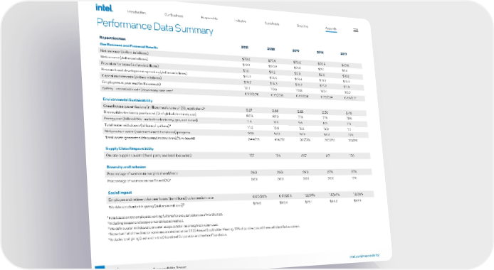 90 intel.com/responsibility 2021-22 Corporate Responsibility Report Performance Data Summary Report Section 2021 2020 2019 2018 2017 Our Business and Financial Results Net revenue (dollars in billions) $79.0 $77.9 $72.0 $70.8 $62.8 Net income (dollars in billions) $19.9 $20.9 $21.0 $21.1 $9.6 Provision for taxes (dollars in billions) $1.8 $4.2 $3.0 $2.3 $10.8 Research and development spending (dollars in billions) $15.2 $13.6 $13.4 $13.5 $13.0 Capital investments (dollars in billions) $18.7 $14.3 $16.2 $15.2 $11.8 Employees at year end (in thousands) 121.1 110.6 110.8 107.4 102.7 Safety – recordable rate 1 /days away case rate 1 0.93/0.20 0.75/0.16 0.69/0.14 0.72/0.14 0.68/0.12 Environmental Sustainability Greenhouse gas emissions (million metric tons of CO 2 equivalent) 2 3.27 2.88 2.88 2.58 2.46 Renewable electricity purchased (% of global electricity use) 80% 82% 71% 71% 73% Energy use (billion kWh – includes electricity, gas, and diesel) 11.6 10.6 9.6 8.3 7.3 Total water withdrawn (billions of gallons) 3 14.3 13.8 12.6 12.0 11.1 Net positive water (water returned + restored) progress 99% 90% 90% 86% 77% Total waste generated (thousand metric tons)/% to landfill 344/5% 414/5% 387/3% 205/7% 183/9% Supply Chain Responsibility On-site supplier audits (third-party and Intel-led audits) 157 126 207 221 170 Diversity and Inclusion Percentage of women in our global workforce 28% 28% 28% 27% 27% Percentage of women on our Board (%) 4 30% 30% 20% 20% 17% Social Impact Employee and retiree volunteer hours (in millions)/volunteerism rate 0.85/20% 0.91/20% 1.2/39% 1.5/64% 1.2/36% Worldwide charitable giving (dollars in millions) 5 $76.0 $80.4 $75.1 $84.2 $89.6 1 Rate based on 100 employees working full time for one year; data is as of March 2022. 2 Including Scope 1 and Scope 2 market-based method. 3 We define water withdrawals, or water usage, as total incoming fresh water used. 4 Note that if all of the director nominees are elected at our 2022 Annual Stockholder Meeting, 30% of our directors will have self-identified as women. 5 Includes total giving (cash and in-kind) from Intel Corporation and the Intel Foundation. Introduction Our Business Responsible Inclusive Sustainable Enabling Appendix