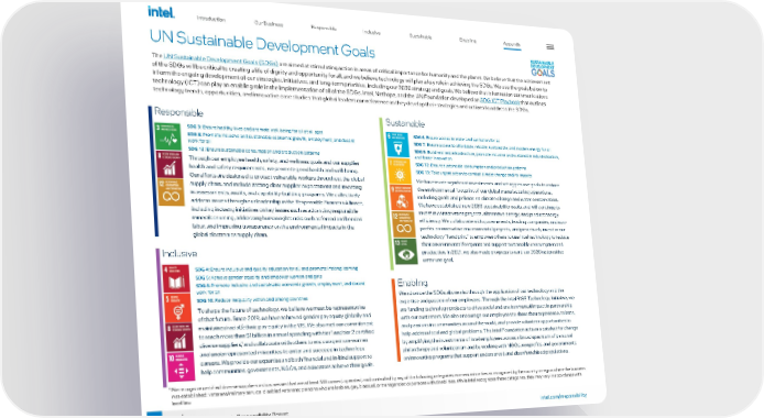 94 intel.com/responsibility 2021-22 Corporate Responsibility Report UN Sustainable Development Goals The UN Sustainable Development Goals (SDGs) are aimed at stimulating action in areas of critical importance for humanity and the planet. We believe that the achievement of the SDGs will be critical to creating a life of dignity and opportunity for all, and we believe technology will play a key role in achieving the SDGs. We use the goals below to inform the ongoing development of our strategies, initiatives, and long-term priorities, including our 2030 strategy and goals. We believe that information communications technology (ICT) can play an enabling role in the implementation of all of the SDGs. Intel, Nethope, and the UN Foundation developed an SDG ICT Playbook that outlines technology trends, opportunities, and innovative case studies that global leaders can reference as they develop their strategies and actions to address the SDGs. Responsible SDG 3: Ensure healthy lives and promote well-being for all at all ages SDG 8: Promote inclusive and sustainable economic growth, employment, and decent work for all SDG 12: Ensure sustainable consumption and production patterns Through our employee health, safety, and wellness goals and our supplier health and safety requirements, we promote good health and well-being. Our efforts are designed to protect vulnerable workers throughout the global supply chain, and include setting clear supplier expectations and investing in assessments, audits, and capability-building programs. We collectively address issues through our leadership in the Responsible Business Alliance, including industry initiatives on key issues such as advancing responsible minerals sourcing, addressing human rights risks such as forced and bonded labor, and improving transparency on the environmental impacts in the global electronics supply chain. Inclusive SDG 4: Ensure inclusive and quality education for all and promote lifelong learning SDG 5: Achieve gender equality and empower women and girls SDG 8: Promote inclusive and sustainable economic growth, employment, and decent work for all SDG 10: Reduce inequality within and among countries To shape the future of technology, we believe we must be representative of that future. Since 2019, we have achieved gender pay equity globally and maintained racial/ethnic pay equity in the US. We also met our commitment to reach more than $1 billion in annual spending with tier 1 and tier 2 certified diverse suppliers, 1 and collaborate with others to encourage more women and underrepresented minorities to enter and succeed in technology careers. We provide our expertise and both financial and in-kind support to help communities, governments, NGOs, and educators achieve their goals. Sustainable SDG 6: Ensure access to water and sanitation for all SDG 7: Ensure access to affordable, reliable, sustainable, and modern energy for all SDG 9: Build resilient infrastructure, promote inclusive and sustainable industrialization, and foster innovation SDG 12: Ensure sustainable consumption and production patterns SDG 13: Take urgent action to combat climate change and its impacts We have made significant investments and set aggressive goals to reduce the environmental footprint of our global manufacturing operations, including goals and policies on climate change and water conservation. We have established new 2030 sustainability goals, and will continue to invest in conservation projects, alternative energy, and product energy efficiency. We collaborate with governments, leading companies, and non - profits on innovative environmental projects, and proactively invest in our technology “handprint” to empower others to use Intel technology to reduce their environmental footprints and support sustainable consumption and production. In 2021, we also made progress toward our 2030 net positive water use goal. Enabling We advance the SDGs above also through the application of our technology and the expertise and passion of our employees. Through the Intel RISE Technology Initiative, we are funding technology projects to drive social and environmental impact in partnership with our customers. We also encourage our employees to share their experience, talents, and passions in communities around the world, and provide volunteer opportunities to help address local and global problems. The Intel Foundation acts as a catalyst for change by amplifying the investments of Intel employees across a broad spectrum of personal philanthropy and volunteerism and by working with NGOs, nonprofits, and governments on innovative programs that support underserved and disenfranchised populations. 1 We recognize certified diverse suppliers as businesses that are at least 51% owned, operated, and controlled by any of the following categories: women; minorities as recognized by the country or region where the business was established; veterans/military service-disabled veterans; persons who are lesbian, gay, bisexual, or transgender; or persons with disabilities. While Intel recognizes these categories, they may vary in accordance with local law. Introduction Our Business Responsible Inclusive Sustainable Enabling Appendix