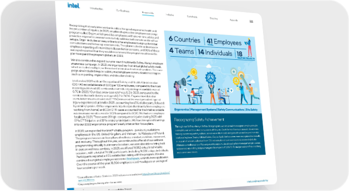 38 2021-22 Corporate Responsibility Report Recognizing that early intervention is critical for good ergonomic health and the prevention of injuries, in 2021, we piloted a proactive employee concierge program called Ergo+, which provides employees with one-on-one advice and proactive ergonomic assessments to help address both remote and in-office setups. Ergo+ includes an easy online tool for employees to sign up for initial consultations and follow-up assessments. The pilot resulted in an increase in employee reporting of intermittent discomfort or concerns, and 90% of those surveyed reported that they would recommend the program to a friend. We plan to expand the program globally in 2022. We also continued to expand our year-round multimedia Safety Always employee awareness campaign. In 2021, we organized our first virtual global safety week, which included multiple, well-received internal and external speakers. The cam - paign also included regular, widely read employee communications on topics such as reporting, ergonomics, and situational safety. Intel ended 2021 with an Occupational Safety and Health Administration (OSHA) recordable rate of 0.93 per 100 employees, compared to the most recently published US semiconductor industry average recordable rate of 0.70 in 2020. 1 Our days away case rate 2 was 0.2 in 2021, compared to the semiconductor industry average of 0.2 in 2020. Ergonomic-related or cumulative trauma disorders (CTDs) remained the most prevalent type of injury experienced at Intel in 2021, accounting for 65% of all reports, followed by strains/sprains. Office ergonomic injuries (predominantly from employees working from home) and COVID-19 cases accounted for the Intel recordable rate increase we observed in 2021 compared to 2020. We had one employee fatality in 2021. There were 31 high-consequence injuries during 2021, with 32% CTD injuries and 32% strain/sprain injuries. We have integrated learnings into our 2022 ergonomics program's early intervention focus plans. In 2021, we expanded the Intel® Vitality program—previously available to employees in the US, United Kingdom, and Vietnam—to Malaysia and Poland. The program focuses on four pillars of wellness: mindset, nutrition, movement, and recovery. Throughout the year, we continued to offer all of our wellness programming virtually, but in some locations, we were also able to bring back in-person wellness services. In 2021, we offered 19,552 virtual Intel Vitality sessions, with a total of 74,810 participants, including 19,320 unique individuals. Participants reported a 95% satisfaction rating with the program. We also continued our global employee access to Headspace , a mindfulness application. Over the course of the year, 18,506 employees used Headspace an average of four sessions per week. Recognizing Safety Achievement Through our Safety Always-Safety Star program, we are proud to recognize employees who exemplify our safety value every day in all they do. Each Safety Star is passionate about main - taining our strong safety culture, serves as a role model, and goes above and beyond to make Intel a safe place. During Global Safety Day in April, the honorees were recognized individually or as part of a team, selected from 124 individual and team nominations received globally. Winners contributed to office ergonomic support, developed safety management processes, addressed site safety, helped mitigate the impact of COVID-19, and provided safety coaching and communications. 1 Source Bureau of Labor Statistics. 2020 indicators are available at https://www.bls.gov/web/osh/ summ1_00.htm . 2 Days away begins the day after the accident. Introduction Our Business Inclusive Sustainable Enabling Appendix Responsible intel.com/responsibility