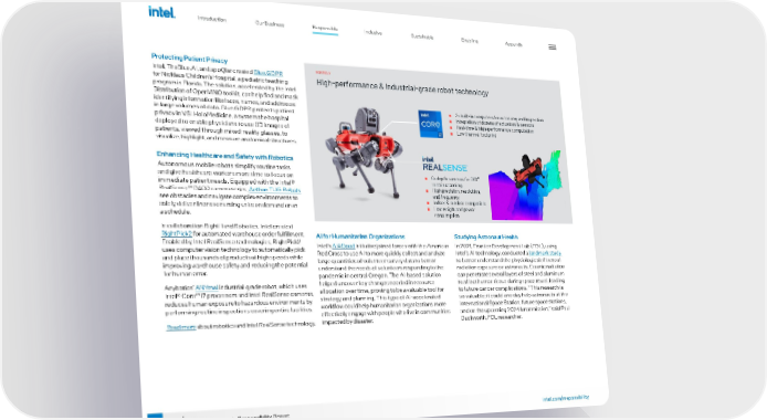 46 2021-22 Corporate Responsibility Report Protecting Patient Privacy Intel, TheBlue.AI, and apoQlar created Blue.GDPR for Nicklaus Children’s Hospital, a pediatric teaching program in Florida. The solution, accelerated by the Intel Distribution of OpenVINO toolkit, can help find and mask identifying information like faces, names, and addresses in large volumes of data. Blue.GDPR protects patient privacy in VSI HoloMedicine, a system the hospital deployed to enable physicians to use 3D images of patients, viewed through mixed-reality glasses, to visualize, highlight, and measure anatomical structures. Enhancing Healthcare and Safety with Robotics Autonomous mobile robots simplify routine tasks and give healthcare workers more time to focus on immediate patient needs. Equipped with the Intel® RealSense™ D400 camera series, Aethon TUG Robots see obstacles and navigate complex environments to safely deliver linens to nursing units on demand or on a schedule. In collaboration RightHand Robotics, Intel created RightPick2 for automated warehouse order fulfillment. Enabled by Intel RealSense technologies, RightPick2 uses computer vision technology to automatically pick and place thousands of products at high speeds while improving warehouse safety and reducing the potential for human error. Anybotics’ ANYmal industrial-grade robot, which uses Intel® Core™ i7 processors and Intel RealSense cameras, reduces human exposure to hazardous environments by performing routine inspections covering entire facilities. Read more about robotics and Intel RealSense technology. AI for Humanitarian Organizations Intel’s AI4Good initiative joined forces with the American Red Cross to use AI to more quickly collect and analyze large quantities of volunteer survey data to better understand the needs of volunteers responding to the pandemic in central Oregon. The AI-based solution helped uncover key changes needed in resource allocation over time, proving to be a valuable tool for strategy and planning. This type of AI-accelerated workflow could help humanitarian organizations more effectively engage with people who live in communities impacted by disaster. // ANYbotics — Get in touch at info@anybotics.com High- performance & industrial -grade robot technology ROBOTS // 5 ■ 2× built -in computers for autonomy and inspection ■ Integration of dozens of actuators & sensors ■ Real -time & high -performance computation ■ Low thermal footprint ■ 6× depth cameras for 360 ° terrain scanning ■ High precision, resolution, and frequency ■ Indoor & outdoor compatible ■ Low weight and power consumption Studying Astronaut Health In 2021, Frontier Development Lab (FDL), using Intel’s AI technology, conducted a landmark study to better understand the physiological effects of radiation exposure on astronauts. Cosmic radiation can penetrate several layers of steel and aluminum to affect human tissue during space travel, leading to future cancer complications. “This research is so valuable; it could one day help astronauts at the International Space Station, future space stations, and on the upcoming 2024 lunar mission,” said Paul Duckworth, FDL researcher. Introduction Our Business Inclusive Sustainable Enabling Appendix Responsible intel.com/responsibility