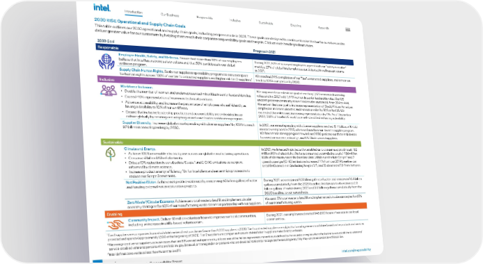 Our Business Responsible Inclusive Sustainable Enabling Appendix 8 intel.com/responsibility 2021-22 Corporate Responsibility Report Introduction 2030 RISE Operational and Supply Chain Goals This table outlines our 2030 operational and supply chain goals, including progress made in 2021. These goals are designed to continue to raise the bar for ourselves and to deliver greater value for our customers by helping them reach their corporate responsibility goals and targets. Click on each heading to learn more. 2030 Goal Progress in 2021 Responsible Employee Health, Safety, and Wellness. Ensure that more than 90% of our employees believe that Intel has a strong safety culture and that 50% participate in our global wellness program. During 2021, 87% of surveyed employees agreed with our “safety is a value” metrics. 27% of global Intel employees participated in wellness programs in 2021. Supply Chain Human Rights. Scale our supplier responsibility programs to ensure respect for human rights across 100% of our tier 1 contracted suppliers and higher risk tier 2 suppliers. 1 We reached 24% completion of our Tier 1 contracted suppliers, and remain on track to 100% completion by 2030. Inclusive Workforce Inclusion. • Double the number of women and underrepresented minorities in senior leadership roles. • Exceed 40% representation of women in technical positions. • Advance accessibility and increase the percentage of employees who self-identify as having a disability to 10% of our workforce. • Ensure that inclusive leadership practices and accountability are embedded in our culture globally by creating and adopting an inclusive leader certification program. We surpassed our milestone goal of reaching 1,375 women in leadership roles, ending 2021 with 1,449 women in senior leadership roles. Our US underrepresented minority senior leaders also increased, from 384 to 444. We set a milestone goal to increase representation of Black/African American employees in senior, director, and executive roles by 10% in the US. We exceeded this milestone, increasing representation by 11%. As of December 2021, 3.8% of Intel’s US workforce self-identified as having a disability. Supplier Diversity. Increase global annual spending with diverse suppliers 2 by 100% to reach $2 billion in annual spending by 2030. In 2021, our annual spending with diverse suppliers reached $1.4 billion, a 10-fold increase compared to 2015, when we launched our diverse supplier program. We have made strong progress toward our 2030 goal and our three milestones focused on women-, minority-, and US Black-owned suppliers. Sustainable Climate and Energy. • Achieve 100% renewable electricity use across our global manufacturing operations. • Conserve 4 billion kWh of electricity. • Drive a 10% reduction in our absolute Scope 1 and 2 GHG emissions as we grow, informed by climate science. • Increase product energy efficiency 10x for Intel client and server microprocessors to reduce our Scope 3 emissions. In 2021, we invested in projects that enabled us to conserve approximately 162 million kWh of electricity. We have conserved a cumulative total of 486 million kWh of electricity since the baseline date. While our absolute Scope 1 and 2 greenhouse gas (GHG) emissions increased 14% from our 2019 baseline, our total GHG emissions (including Scopes 1, 2, and 3) decreased 2% from last year. Net Positive Water. Achieve net positive water use by conserving 60 billion gallons of water and funding external water restoration projects. During 2021, we conserved 9.3 billion gallons of water and conserved 16.4 billion gallons cumulatively from the 2020 baseline. Intel projects also restored 2.3 billion gallons of water during 2021 and 3.6 billion gallons cumulatively from the 2020 baseline, to our watersheds. Zero Waste 3 /Circular Economy. Achieve zero total waste to landfill and implement circular economy strategies for 60% of our manufacturing waste streams in partnership with our suppliers. We sent 5% total waste to landfill and implemented circular strategies for 65% of our manufacturing waste. Enabling Community Impact. Deliver 10 million volunteer hours to improve our local communities, including an increase in skills-based volunteerism. During 2021, our employees donated 848,000 hours of service in our local communities. 1 Tier 1 suppliers are companies from which Intel makes direct purchases (more than 9,000 suppliers in 2021). Tier 1 contracted suppliers are subject to formal agreements with Intel based on the products and services provided and spends (approximately 1,500 at the beginning of 2021). Tier 2 suppliers are companies from which Intel’s tier 1 suppliers make direct purchases. 2 We recognize diverse suppliers as businesses that are 51% owned and operated by at least one of the following: women; minorities as defined by the country or region where the business was established; veterans/ service-disabled veterans; persons who are lesbian, gay, bisexual, or transgender; or persons who are disabled. While Intel recognizes these categories, they may vary in accordance with local law. 3 Intel defines zero waste as less than 1% sent to landfill.
