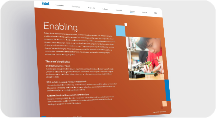 79 intel.com/responsibility 2021-22 Corporate Responsibility Report Enabling Acting alone, Intel cannot achieve the broad, societal impact we aspire to. We are committed to creating a better world through the power of our technology and the expertise and passion of our employees. We also believe that the health of our company and the communities where we operate depends on an increasingly inclusive community of innovators prepared for the jobs of the future. Acting on Intel and the Intel Foundation’s vision, “Empowering human potential. Igniting positive change,” we are challenging ourselves to do even more. Our mission is to empower youth and communities with the skills and confidence to rise, advance, and excel by bringing people, partnerships, and technology together. This year’s highlights 848,000 volunteer hours Over the past decade, Intel employees donated more than 10 million volunteer hours. Despite COVID-19-related challenges, our employees and retirees found ways to continue to support local communities—including virtual activities—by volunteering more than 848,000 hours globally in 2021. $9.5 million invested in social impact tech Through the Intel RISE Technology Initiative (IRTI), we have invested $9.5 million for more than 60 projects addressing health and life sciences, education, economic recovery, social equity and human rights, accessibility, and sustainability. $760 million Intel Foundation contributions Since its founding in 1988, the Intel Foundation has enabled positive social impact for our local communities and for underserved populations through more than $760 million in funding of programs and STEM initiatives. Introduction Our Business Responsible Inclusive Sustainable Appendix Enabling